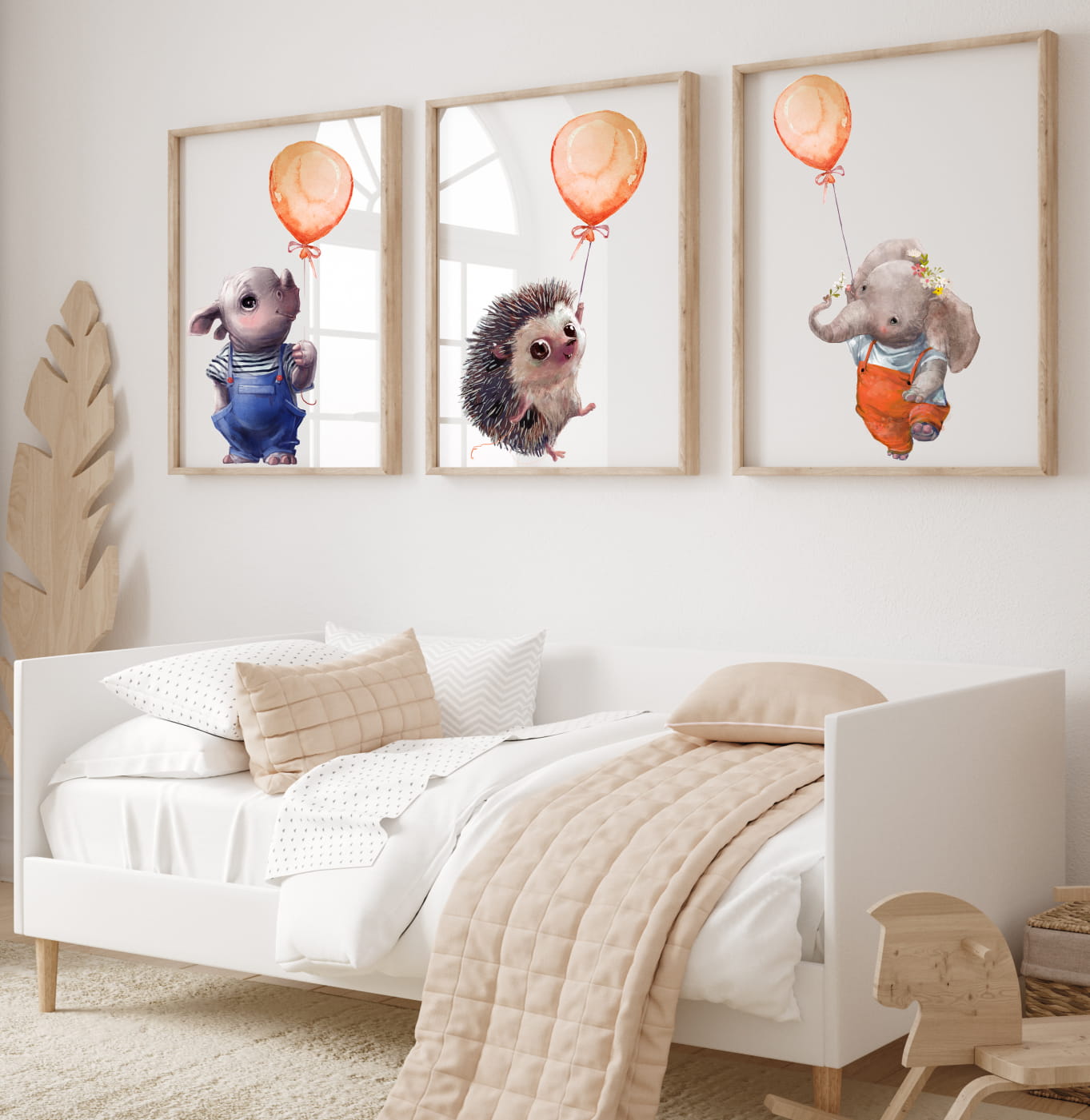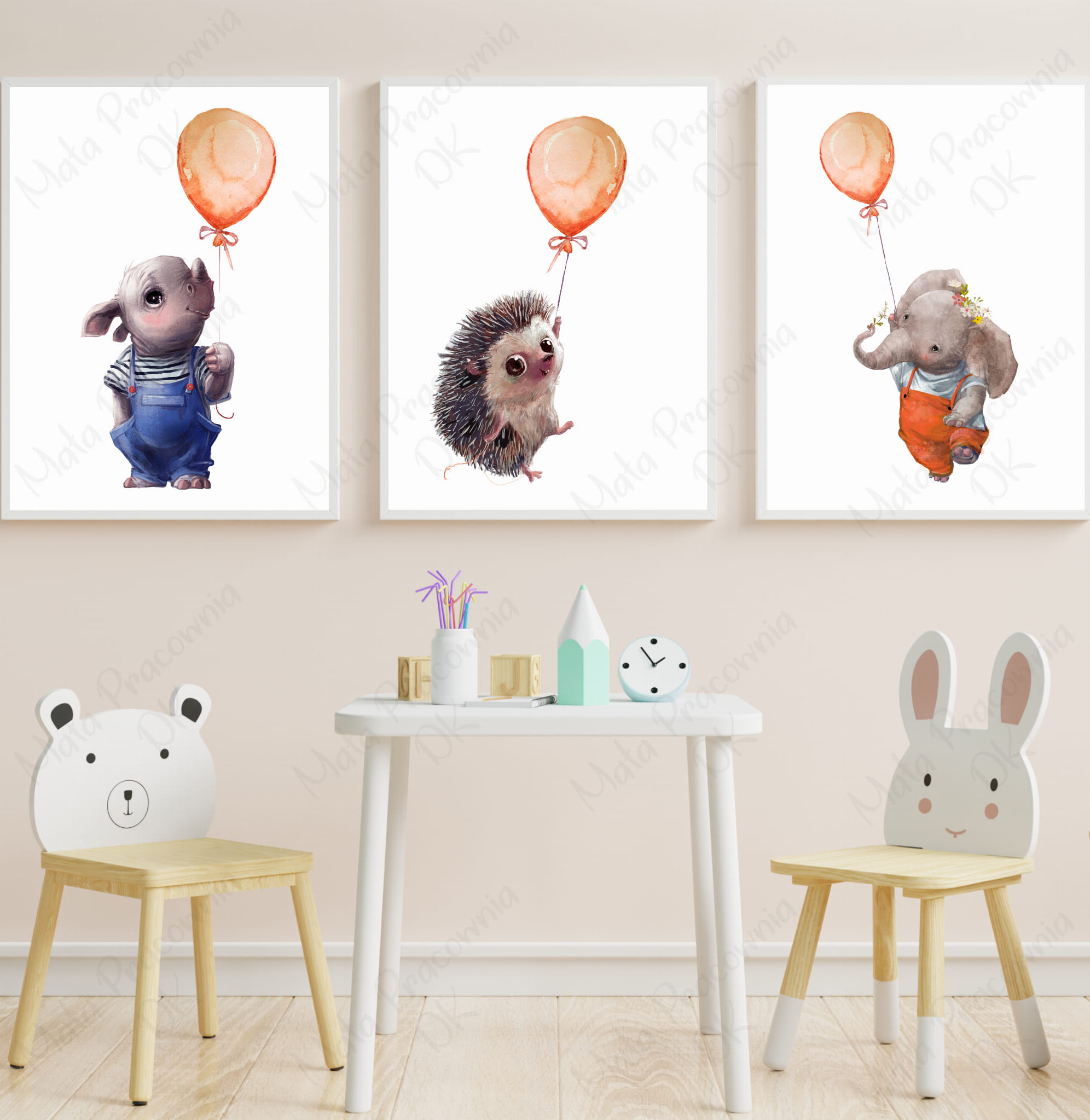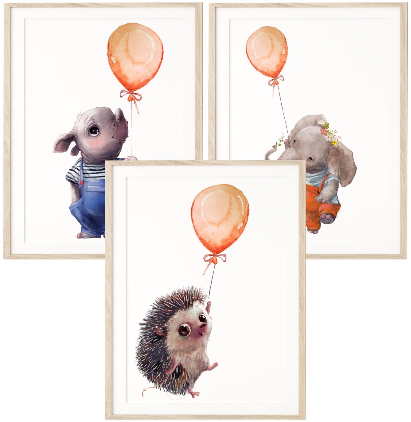 Ten zestaw trzech plakatów przedstawia przyjazne zwierzątka – nosorożca, jeża oraz słonika z balonikami. Subtelne kolory i delikatne akwarelowe ilustracje tworzą bajkowy nastrój, który wprowadzi ciepło i harmonię do dziecięcego wnętrza.
