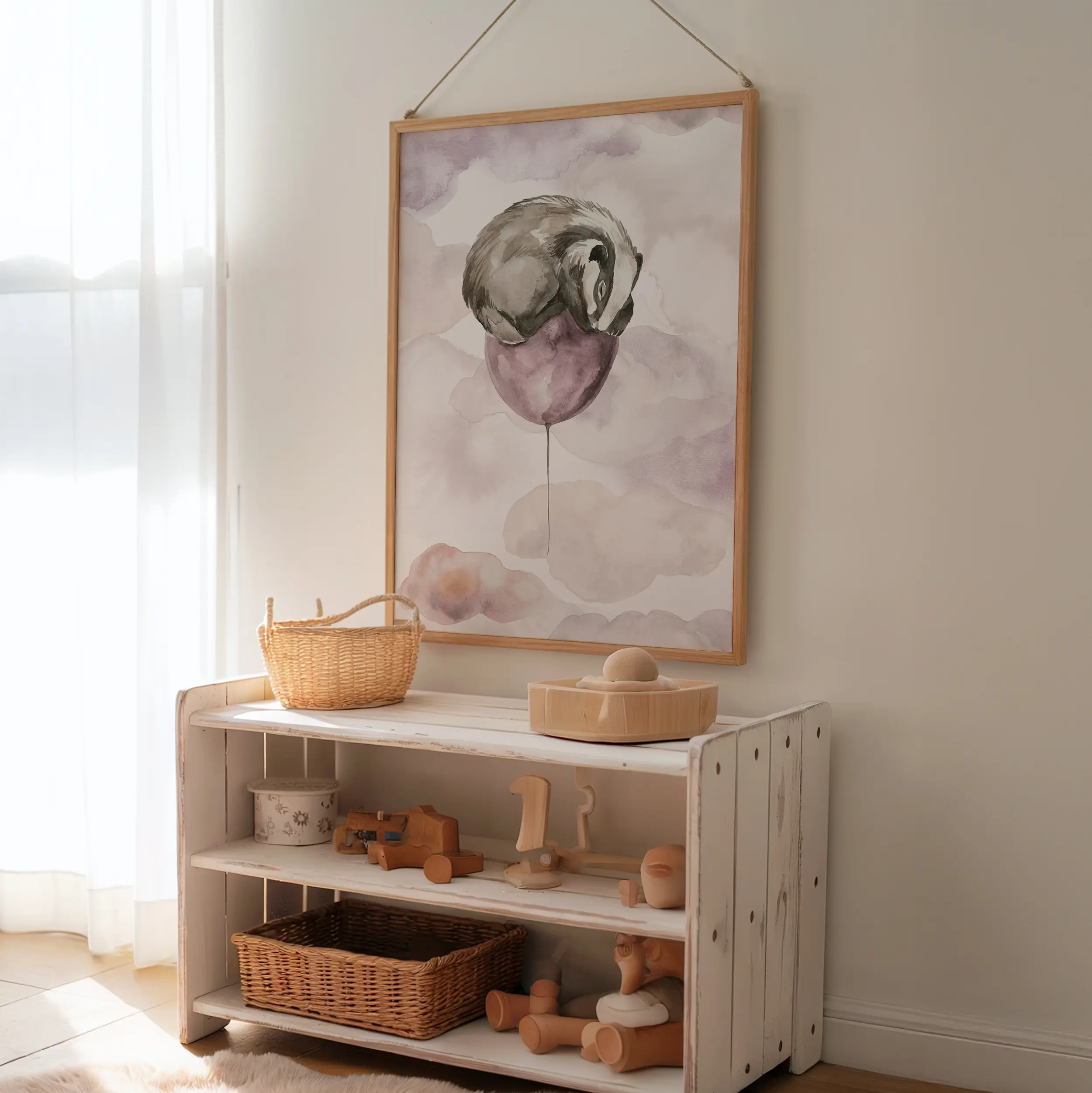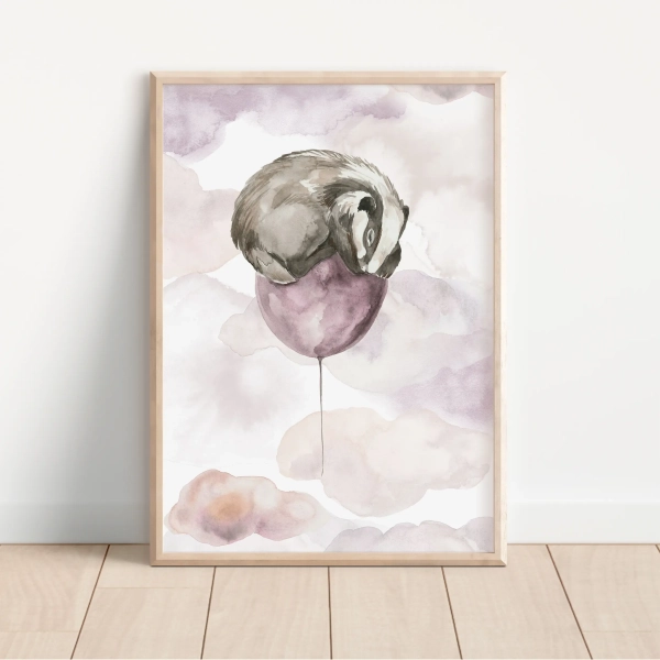 Niektóre ilustracje opowiadają historie bez słów. Ten plakat zaprasza do świata, w którym zwierzęta marzą, unoszą się nad chmurami i przypominają, że wszystko jest możliwe. Borsuk szybujący na baloniku to subtelny, bajkowy motyw, który przyciąga wzrok i wywołuje uśmiech.