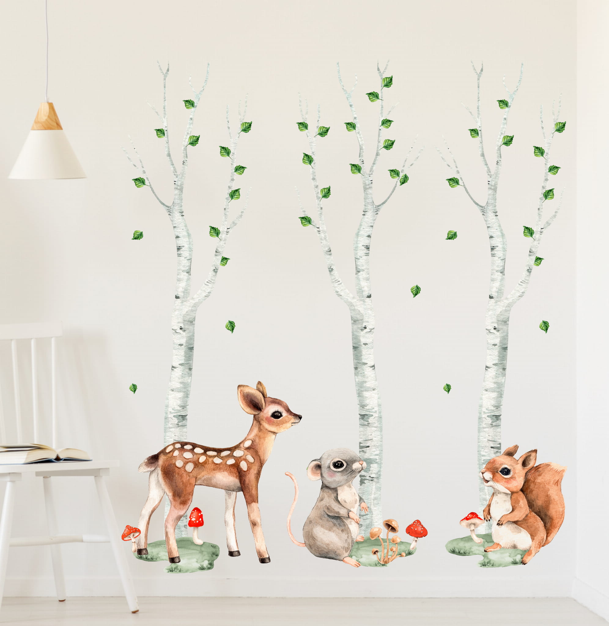 Naklejka z brzozami dobrze sprawdza się w pokoju dziecka i pasuje do różnych aranżacji. Jasne drzewa i delikatne liście tworzą spokojną, naturalną przestrzeń bez przytłaczania wnętrza. Elementy można rozmieścić dowolnie, dopasowując układ do ściany.