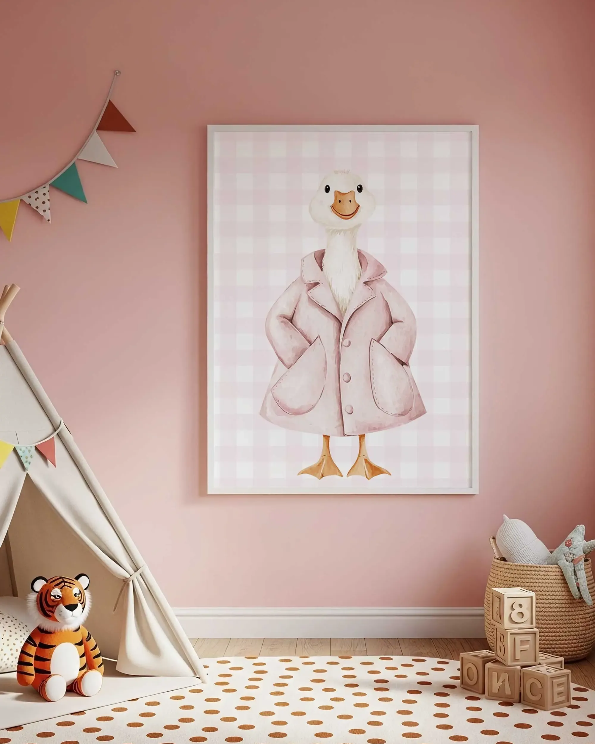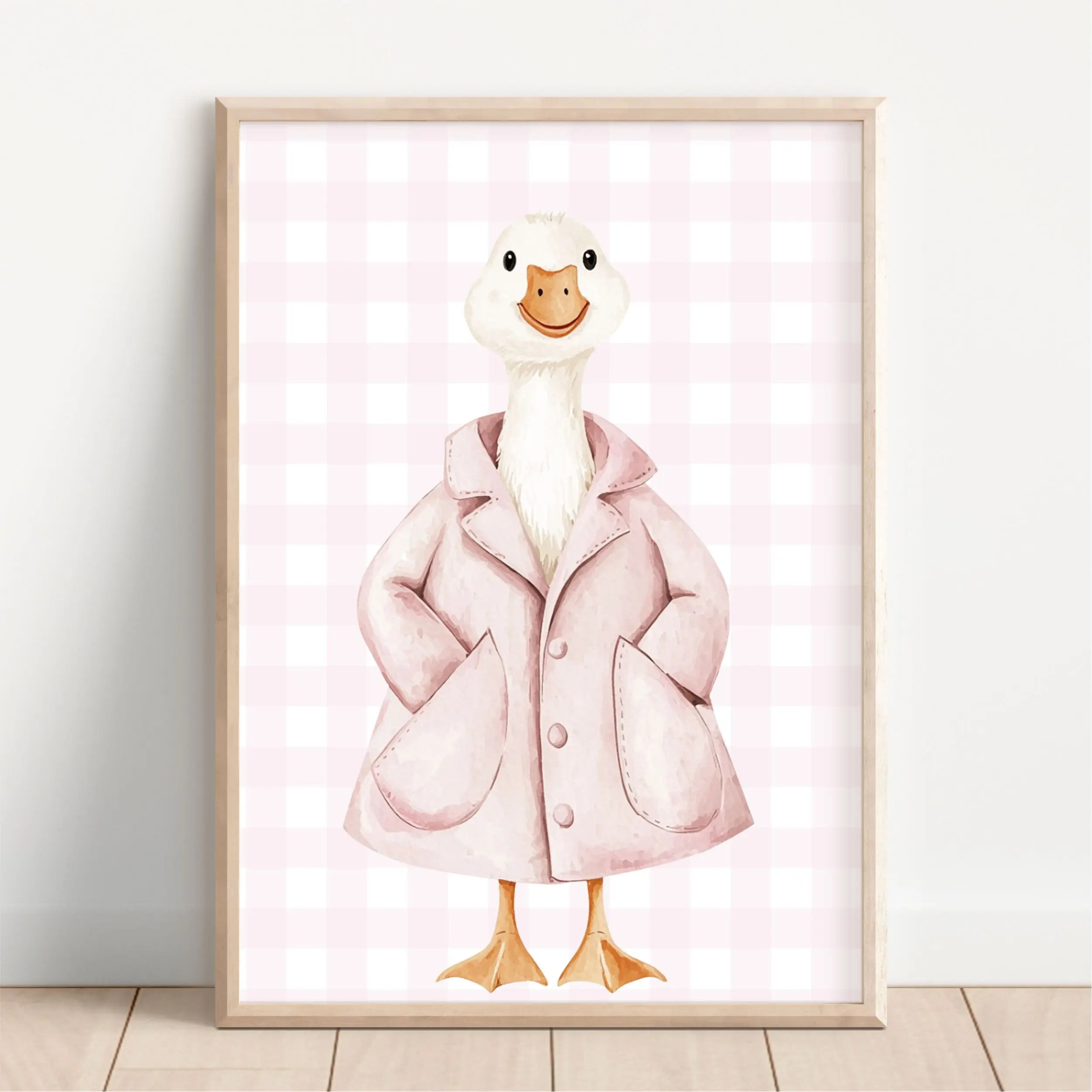 Plakat przedstawia gąskę w płaszczyku w pastelowych odcieniach różu. Idealny do pokoju dziecka urządzonego w stylu retro.