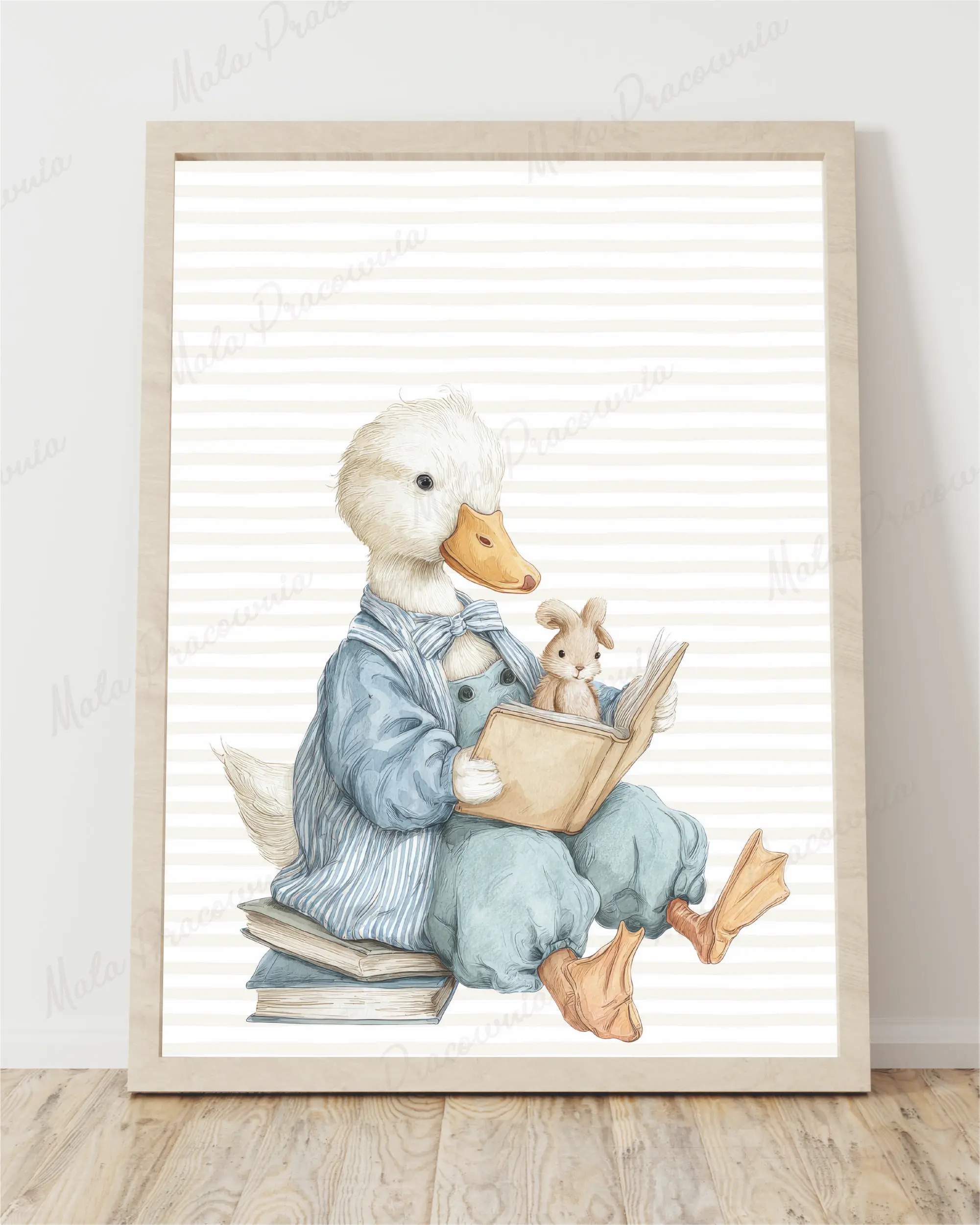 Uroczy plakat z gąską i króliczkiem w pastelowych odcieniach błękitu to delikatna ozdoba pokoju dziecka, pełna ciepła i spokoju.