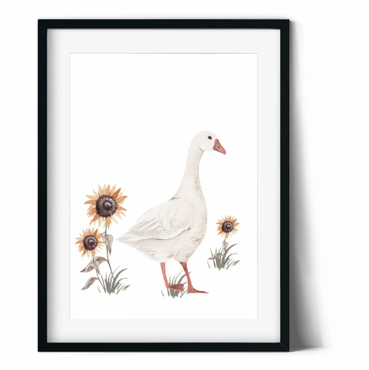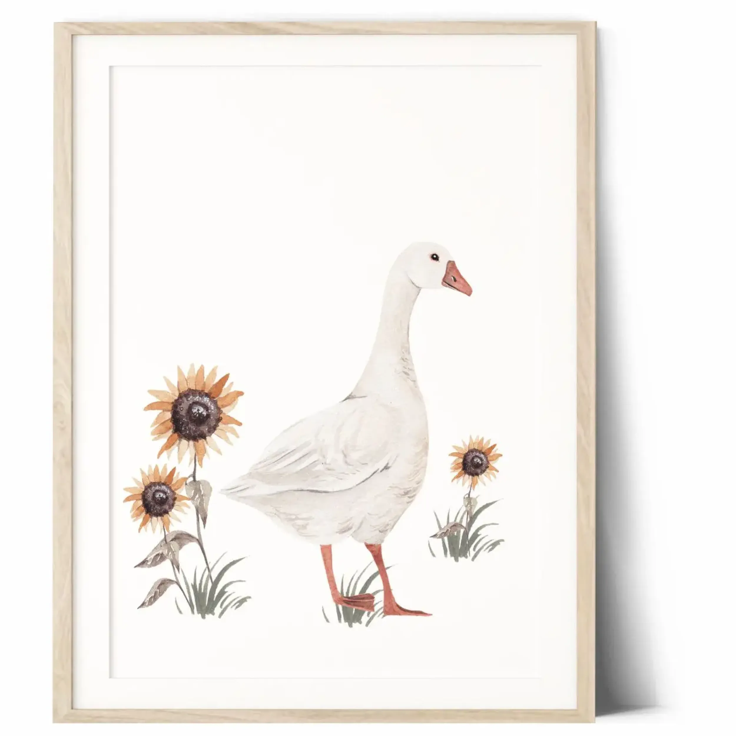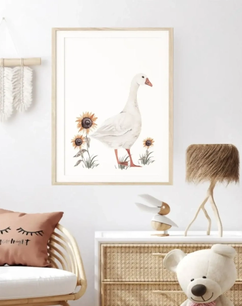 Wprowadź do wnętrza ciepło letniego ogrodu! Plakat przedstawiający uroczą gąskę w otoczeniu słoneczników to delikatna i pełna uroku dekoracja, która doda dziecięcemu pokojowi przytulności i harmonii.