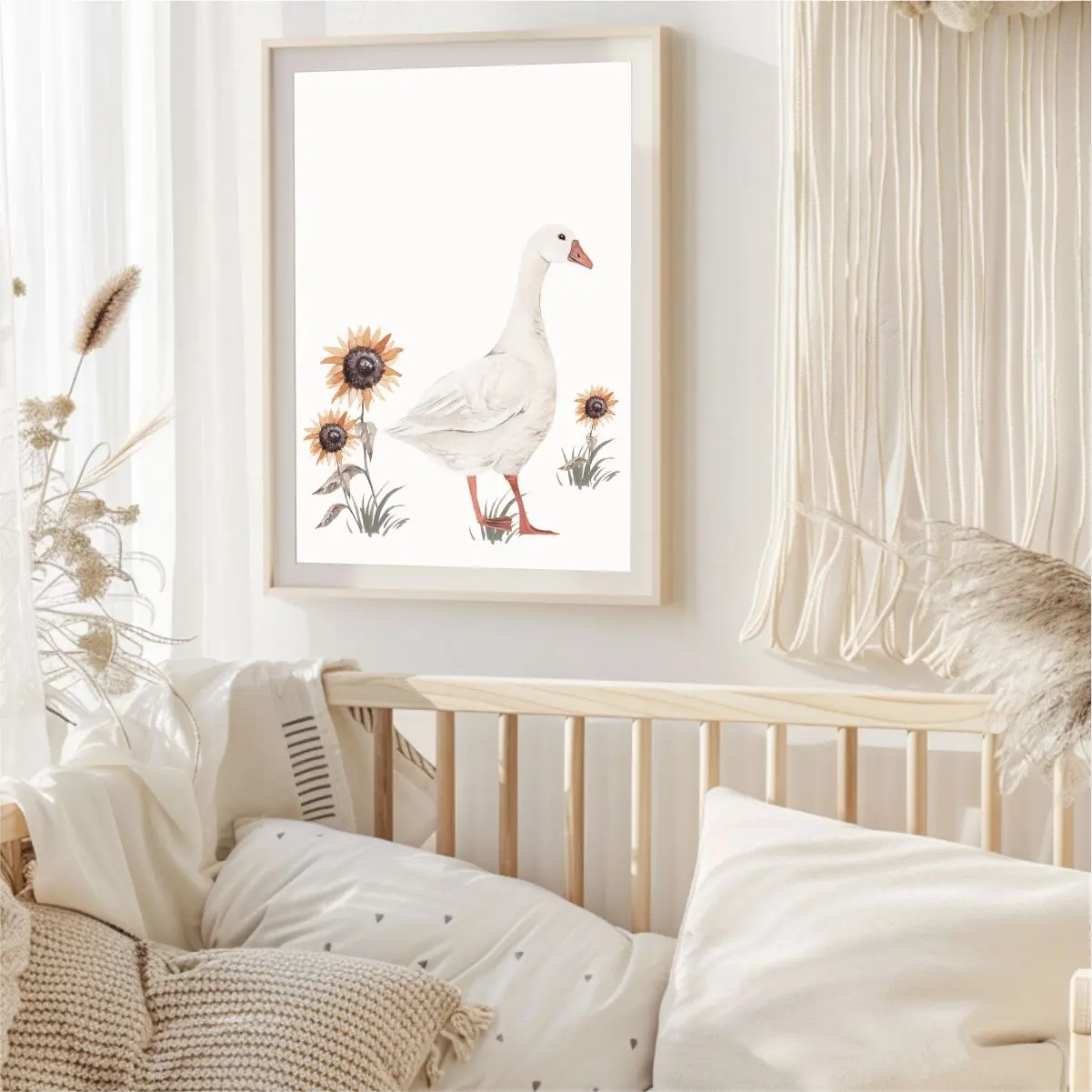 Plakat z uroczą gąską wśród słoneczników — idealna dekoracja do pokoju dziecka. Ciepłe, pastelowe kolory wprowadzą radosny i przytulny klimat do wnętrza.