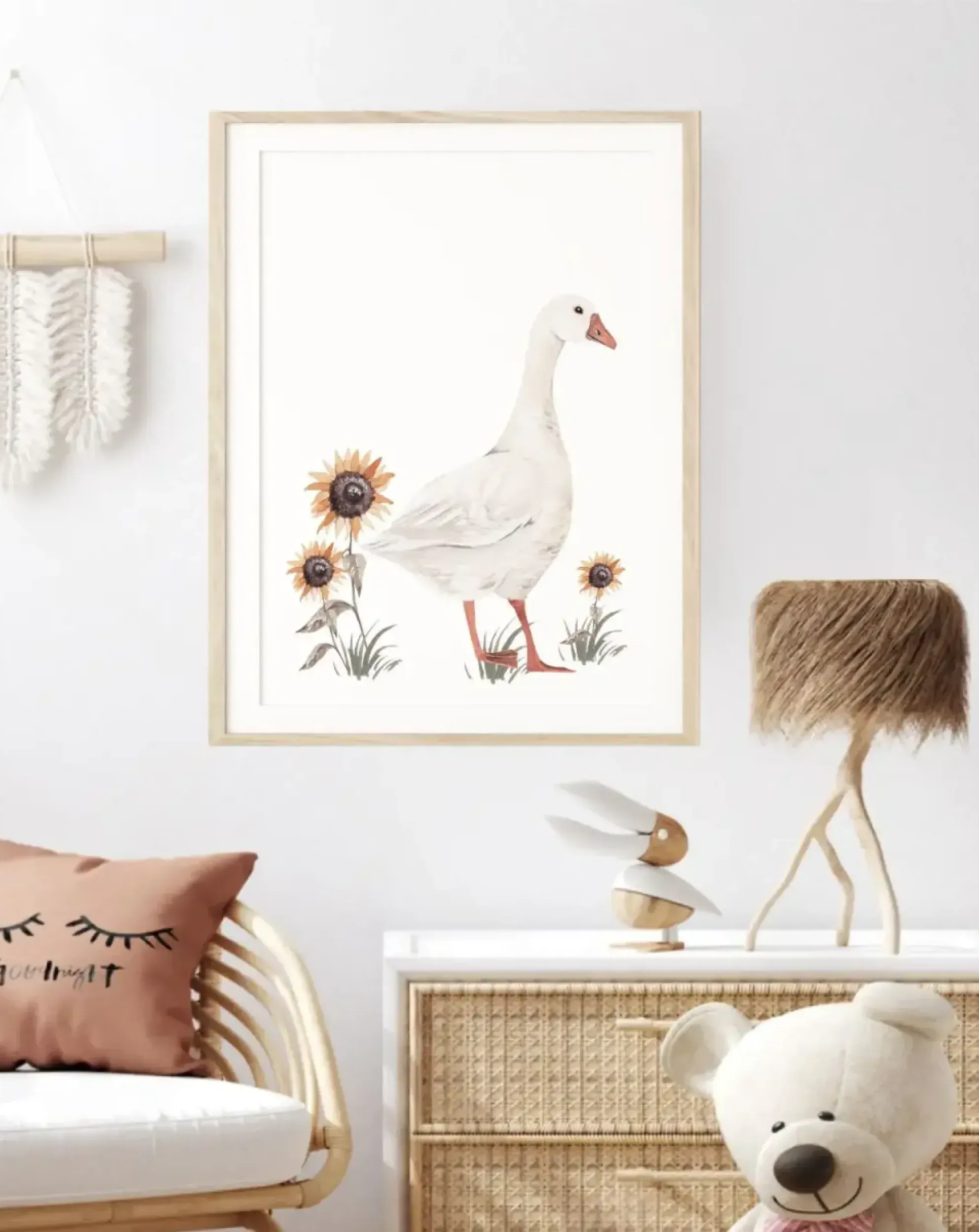 Plakat świetnie komponuje się z innymi produktami z kolekcji Gąski, tworząc harmonijną i bajkową aranżację wnętrza.