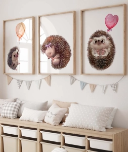 Zestaw sprawdzi się jako dekoracja nad łóżeczkiem, komodą lub w kąciku zabaw. Plakaty z jeżami i balonikami wprowadzają do pokoju dziecka ciepły klimat i radosną atmosferę. To idealna ozdoba dla niemowlaka lub przedszkolaka.