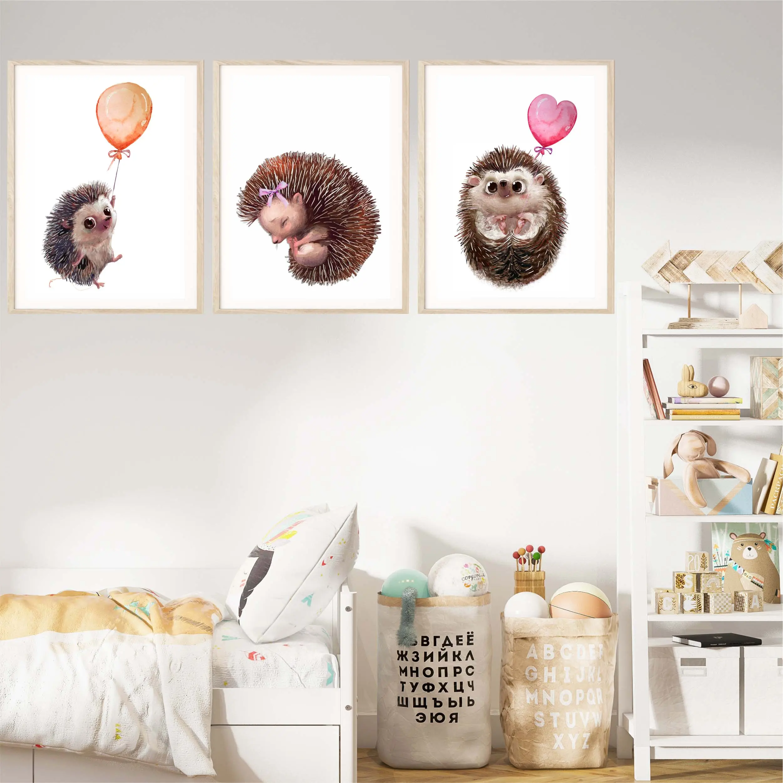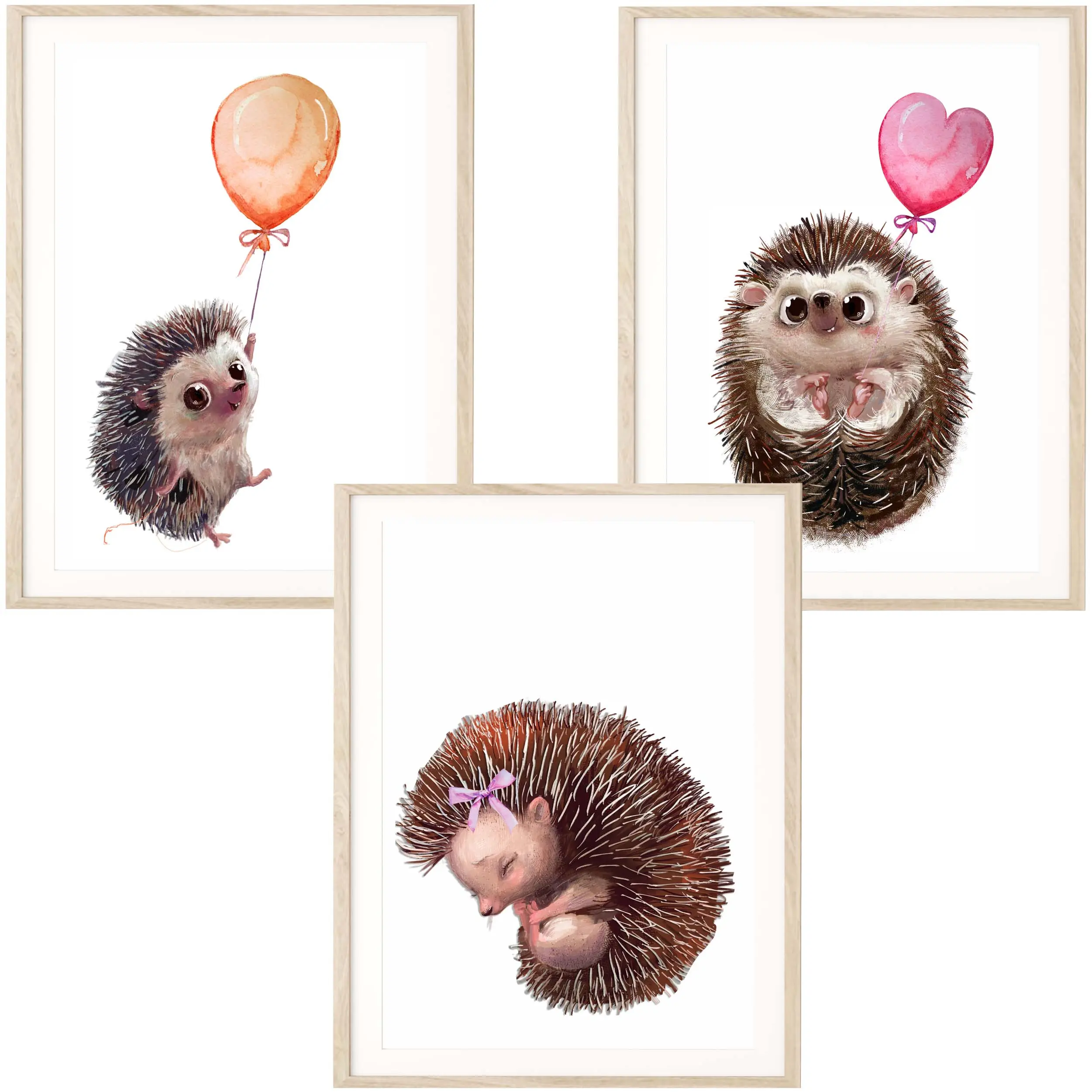 Zestaw 3 plakatów z uroczymi jeżykami i balonikami. Delikatna dekoracja ścienna do pokoju dziecka – pastelowa, lekka, idealna nad łóżeczko.