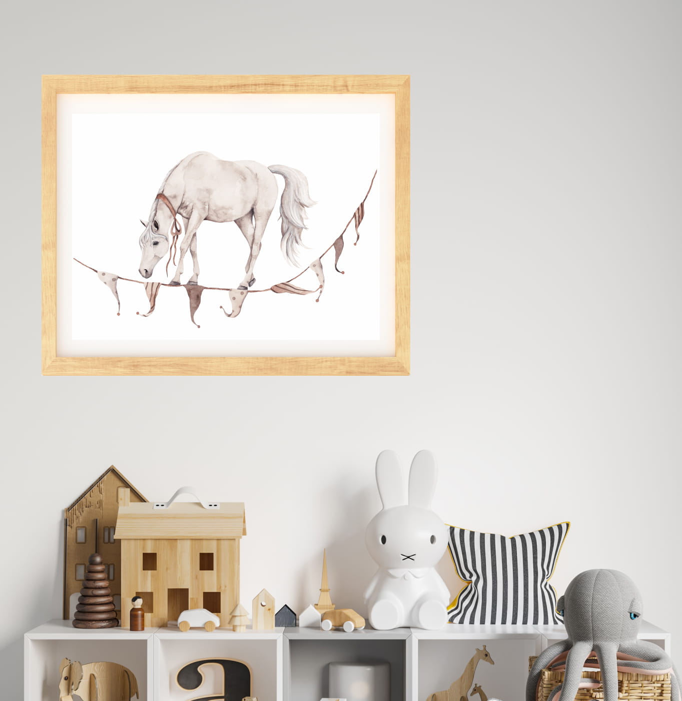 Na delikatnej girlandzie, rozwieszonej jak most między chmurami, kroczy dumnie koń – lekki jak wiatr, wolny jak marzenia. Jego rytmiczne kroki nadają melodii bajkom, które opowiadają dzieci przed snem. To nie tylko obrazek – to opowieść, która każdego dnia może mieć inne zakończenie, wymyślone przez małych marzycieli.