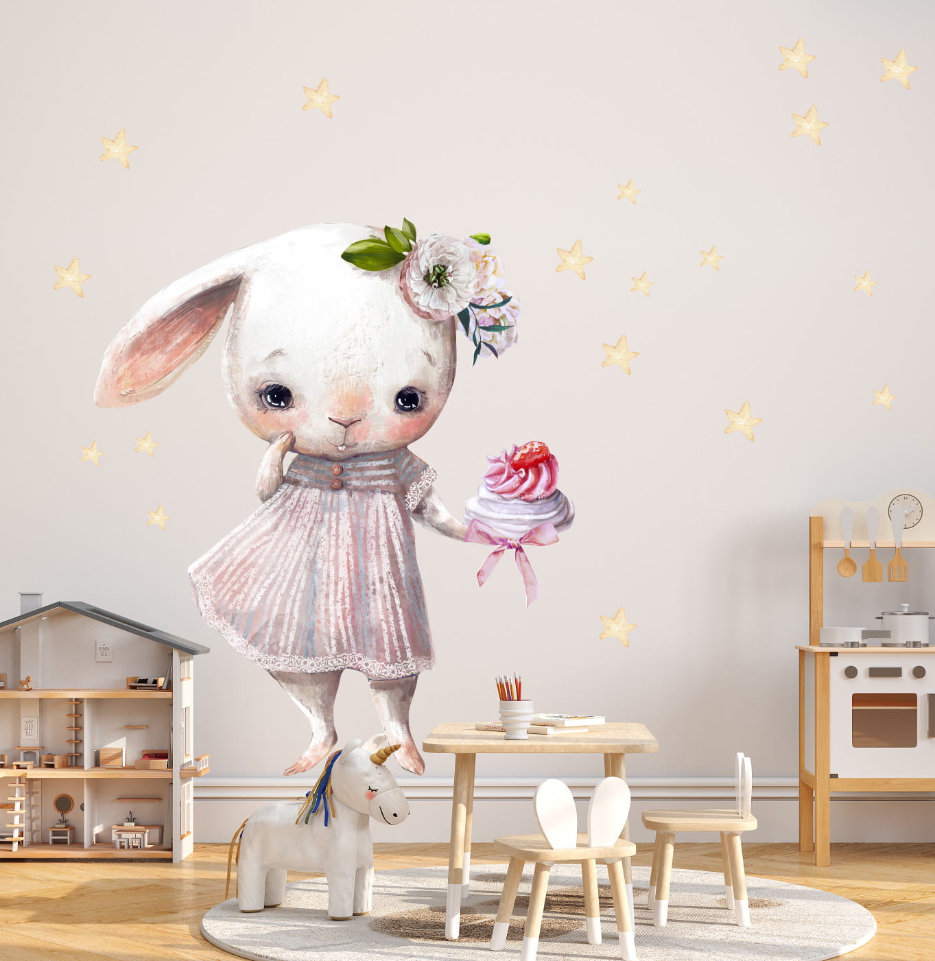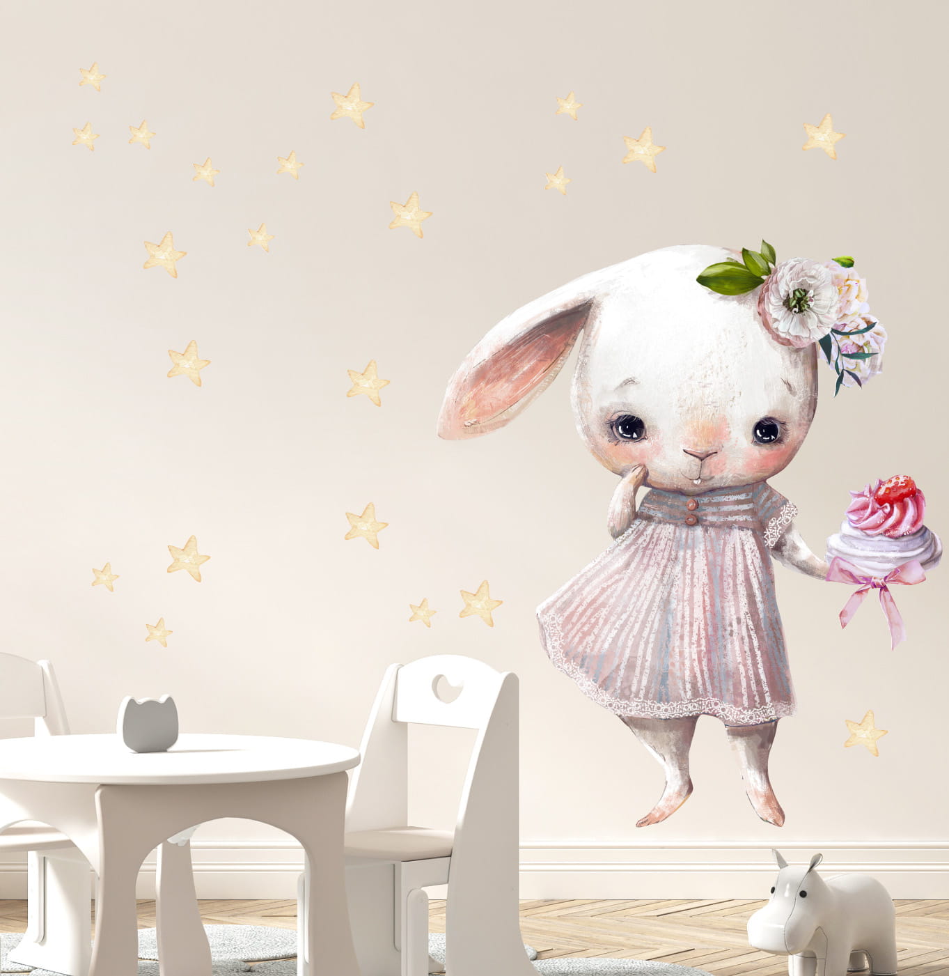 Zaproś tego uroczego króliczka do dziecięcego pokoju i stwórz przestrzeń pełną ciepła, marzeń i bajkowej magii.
