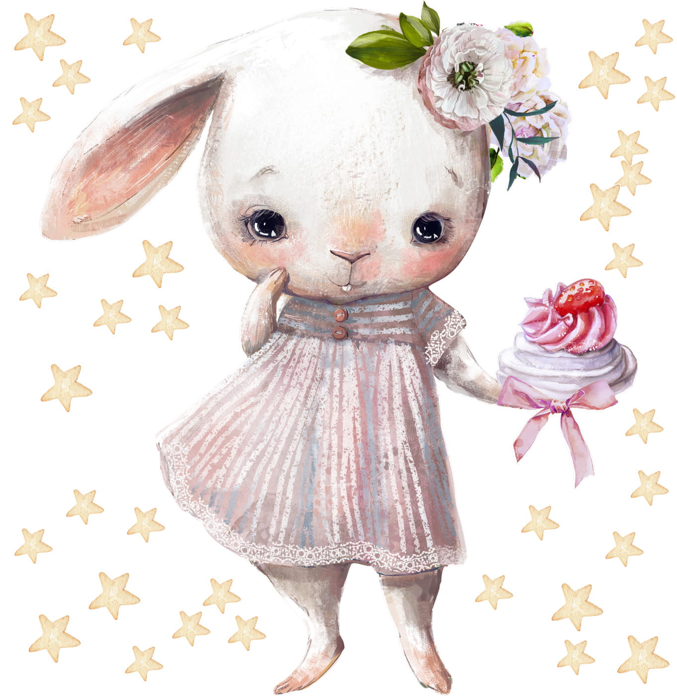 Oto króliczek jak z baśni – maleńka dziewczynka o wielkich, błyszczących oczkach, ubrana w sukienkę w delikatne paseczki. W jej łapkach spoczywa małe ciasteczko, jakby właśnie miała się nim podzielić. Na głowie ma subtelny wianuszek z kwiatków, który dodaje jej uroku i lekkości. Wokół króliczka wirują złote gwiazdki, tworząc magiczną, spokojną atmosferę.