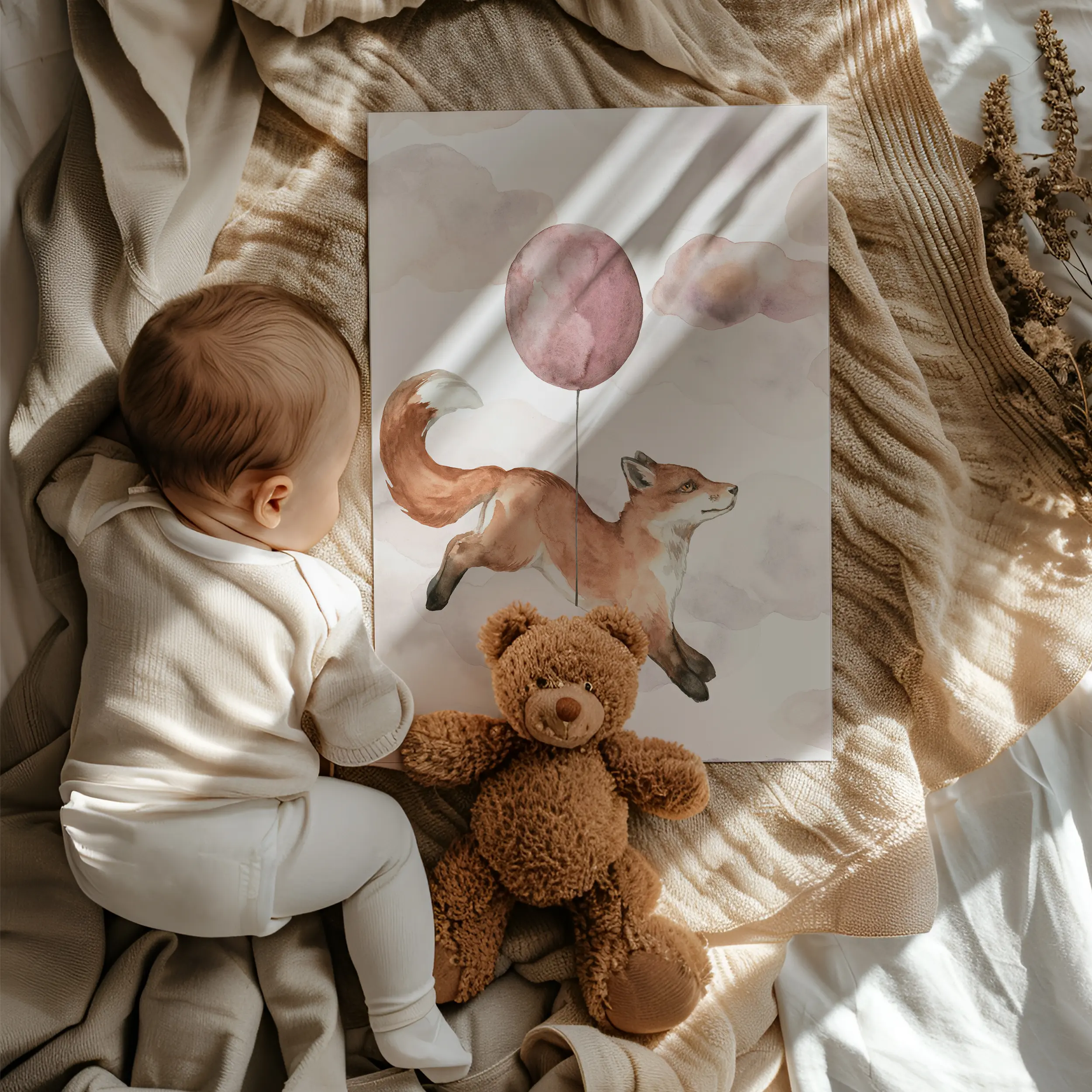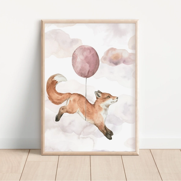 Plakat z liskiem i balonikiem łączy w sobie ruch, lekkość i subtelność – motyw, który naturalnie wpisuje się w pokój dziecka, niezależnie od wieku. To ilustracja, która pięknie dopełnia przestrzeń i zostaje z dzieckiem na dłużej.