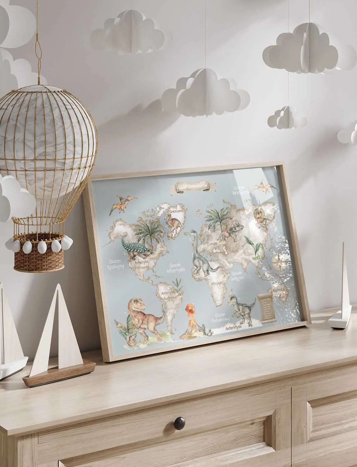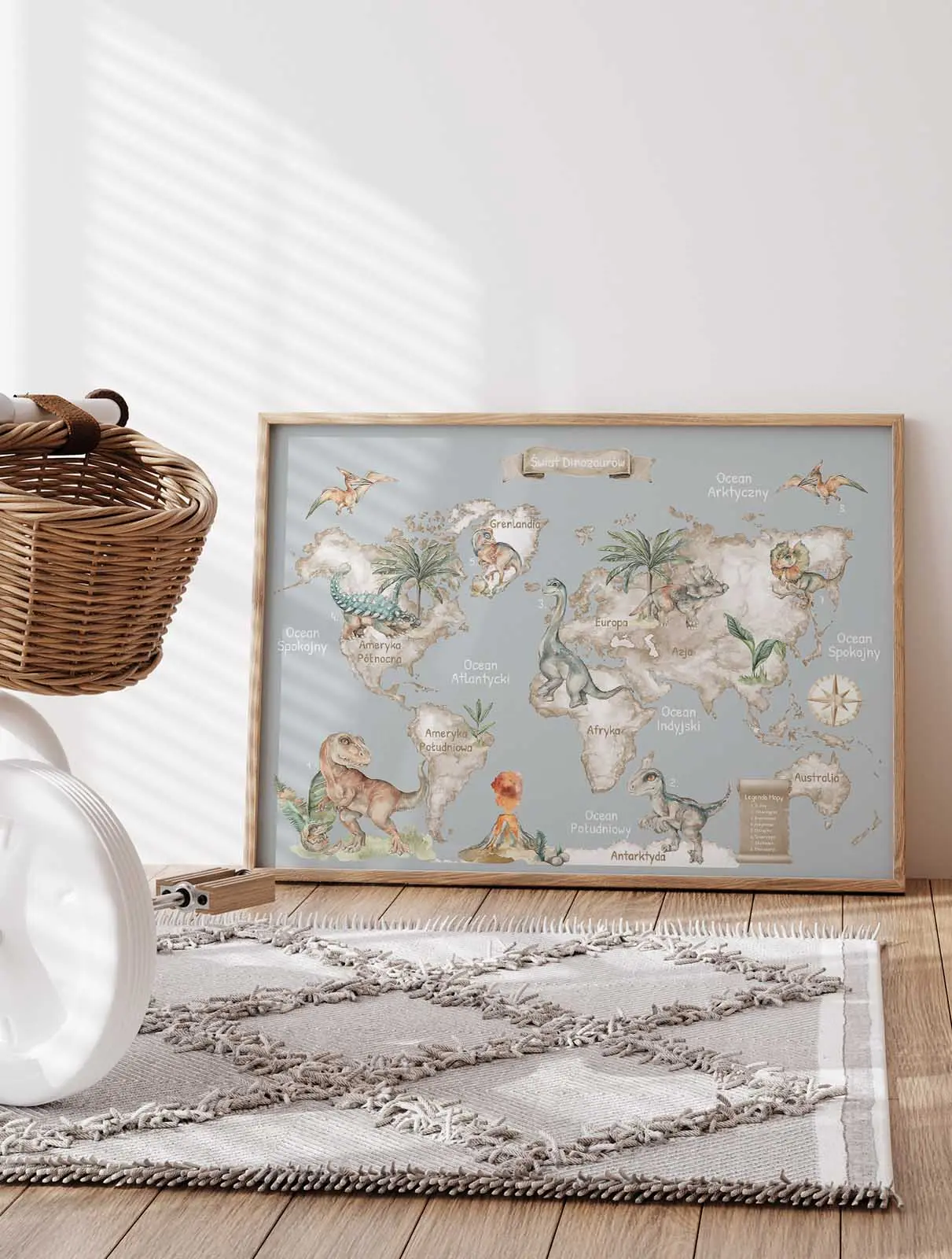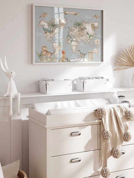 Neutralna, szara kolorystyka idealnie pasuje do pokoju chłopca lub dziewczynki, szczególnie we wnętrzach urządzonych w stylu skandynawskim, Montessori lub boho. To nie tylko estetyczna dekoracja, ale także punkt wyjścia do rozmów o geografii i historii naturalnej.