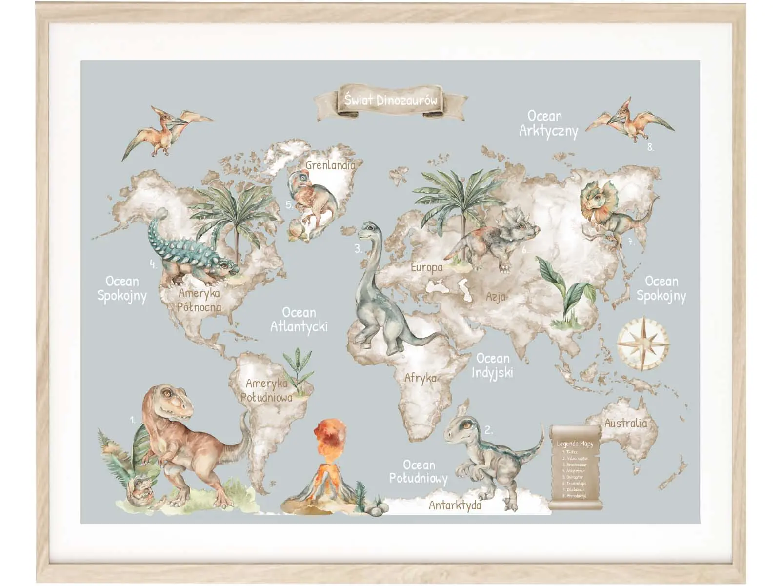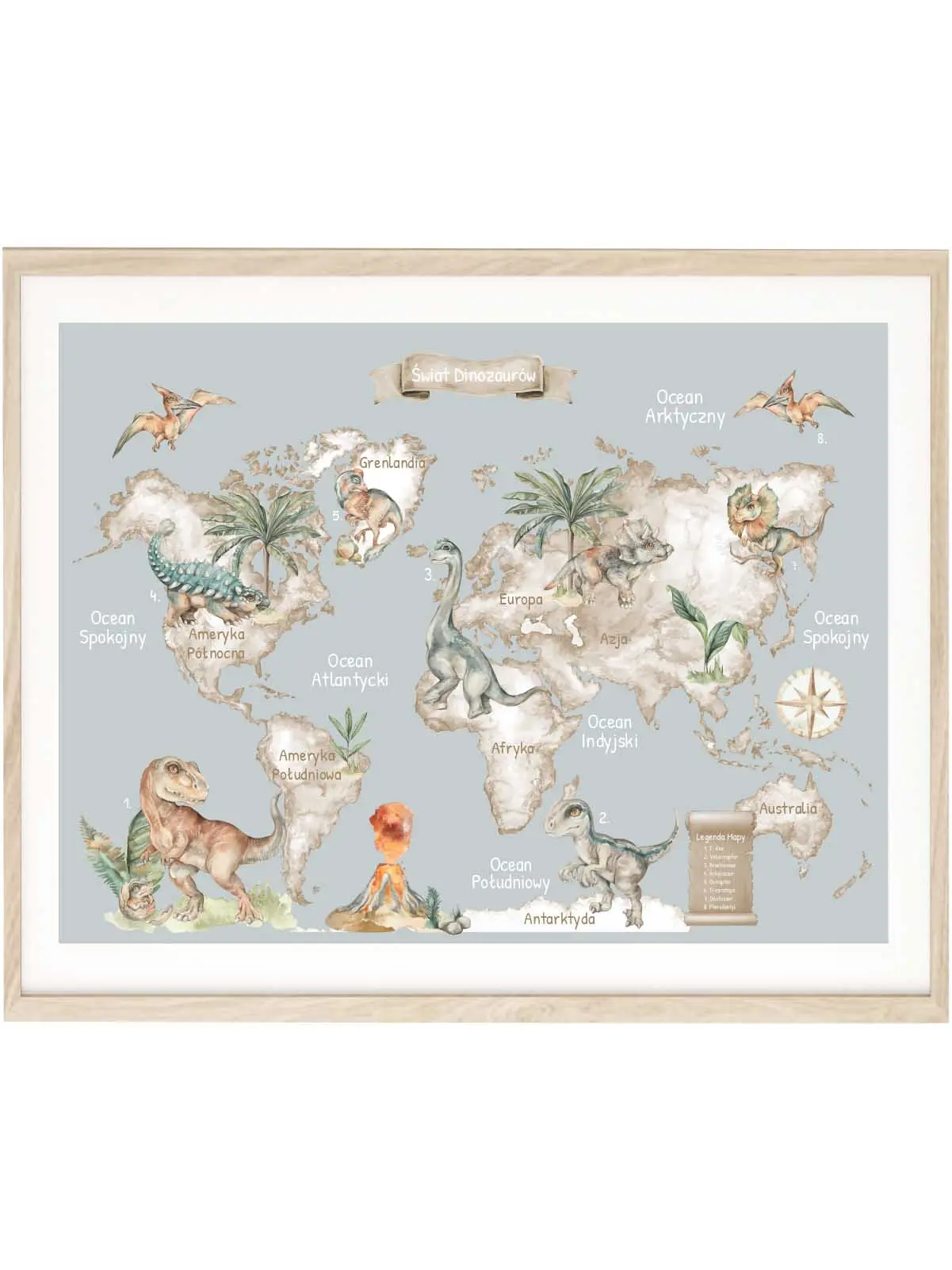 Szara wersja plakatu „Mapa Świata Dinozaury” to propozycja dla rodziców ceniących stonowane kolory, styl vintage oraz wartość edukacyjną. Na mapie zaznaczono kontynenty, oceany i ilustracje prehistorycznych zwierząt. Każdy gatunek przyporządkowany został do odpowiedniego obszaru geograficznego, co wspiera naukę i rozwija wyobraźnię.