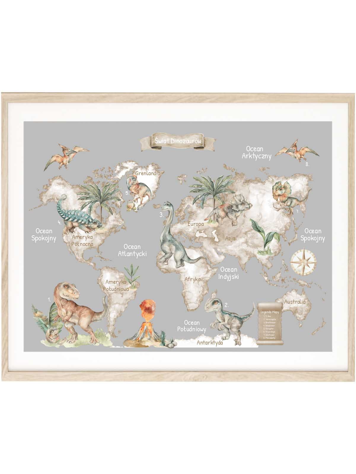 Stylowy plakat edukacyjny z mapą świata i dinozaurami w szarej wersji. Doskonały do pokoju dziecka w stylu vintage lub minimalistycznym. Mała Pracownia