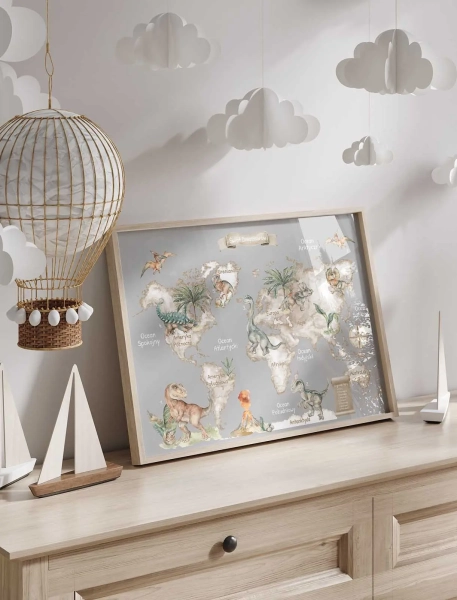 Neutralna, szara kolorystyka idealnie pasuje do pokoju chłopca lub dziewczynki, szczególnie we wnętrzach urządzonych w stylu skandynawskim, Montessori lub boho. To nie tylko estetyczna dekoracja, ale także punkt wyjścia do rozmów o geografii i historii naturalnej.