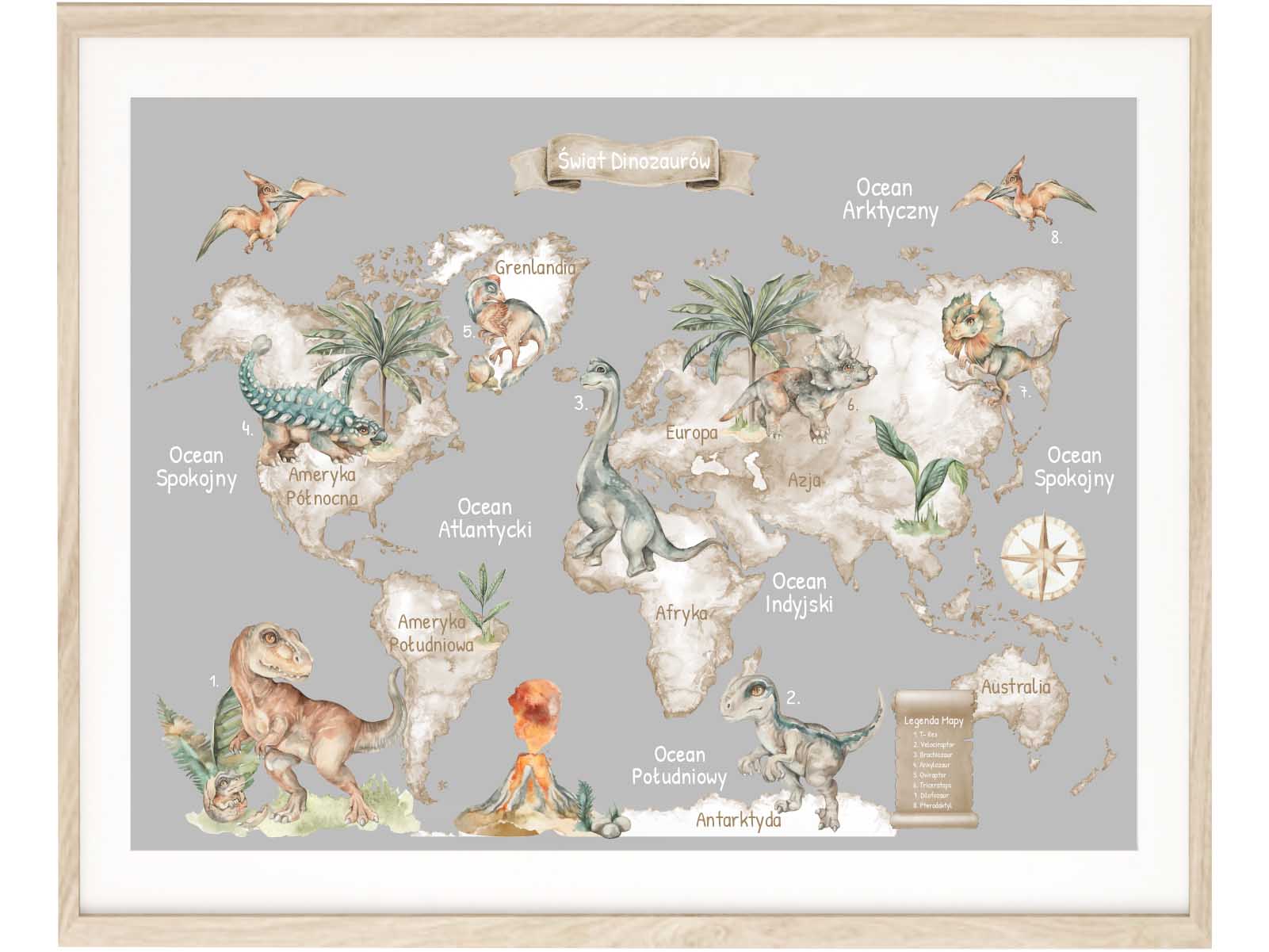 Szara wersja plakatu „Mapa Świata Dinozaury” to propozycja dla rodziców ceniących stonowane kolory, styl vintage oraz wartość edukacyjną. Na mapie zaznaczono kontynenty, oceany i ilustracje prehistorycznych zwierząt. Każdy gatunek przyporządkowany został do odpowiedniego obszaru geograficznego, co wspiera naukę i rozwija wyobraźnię.