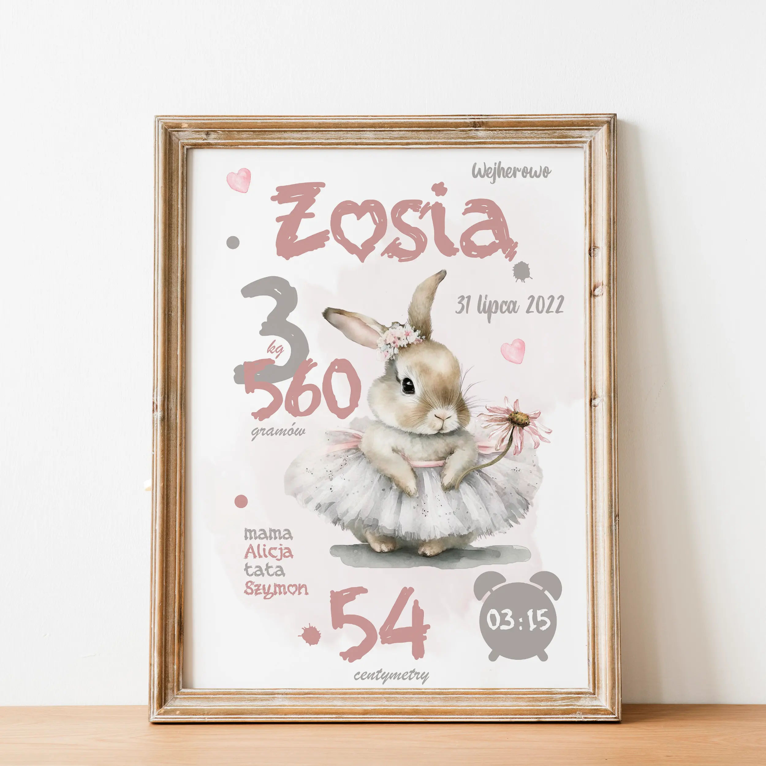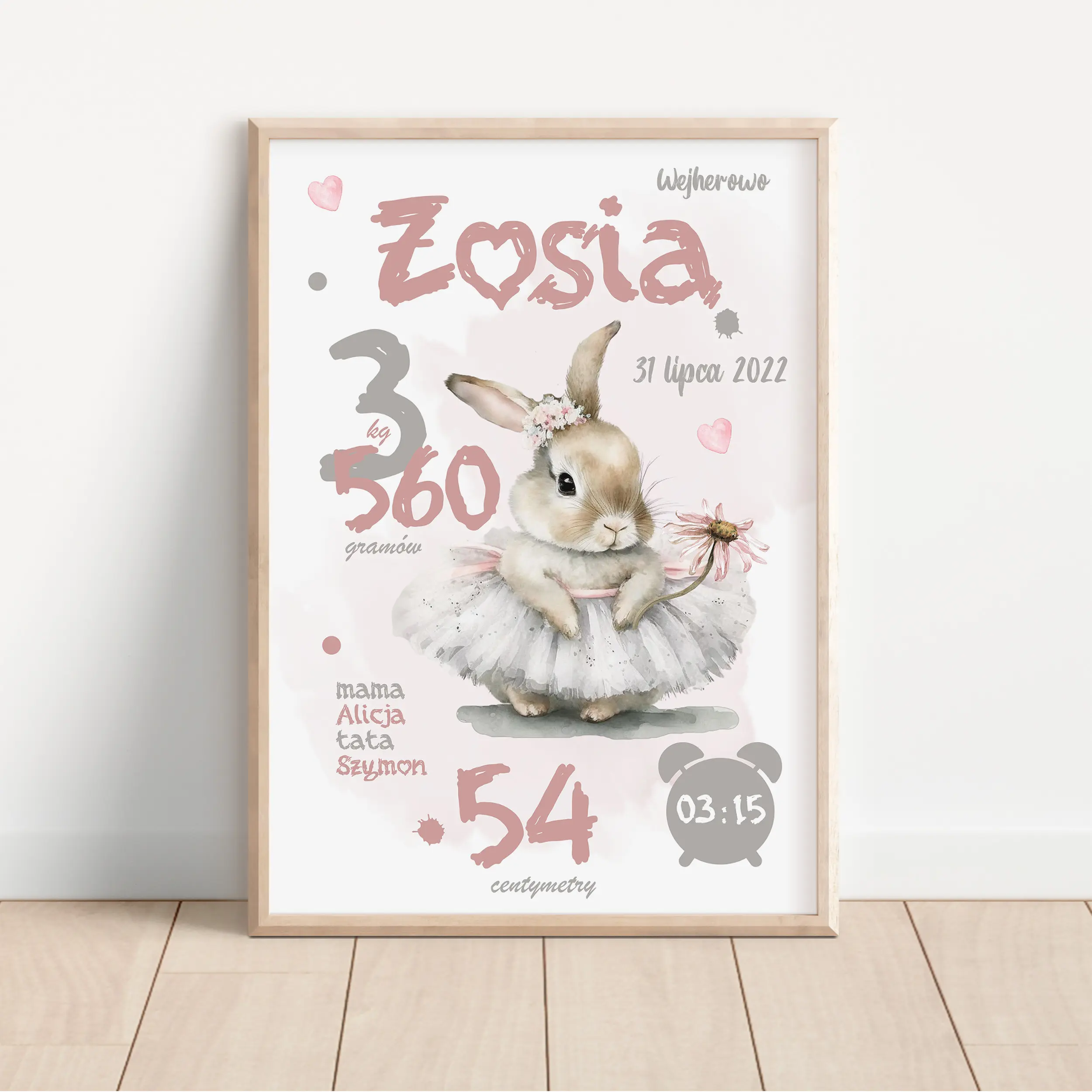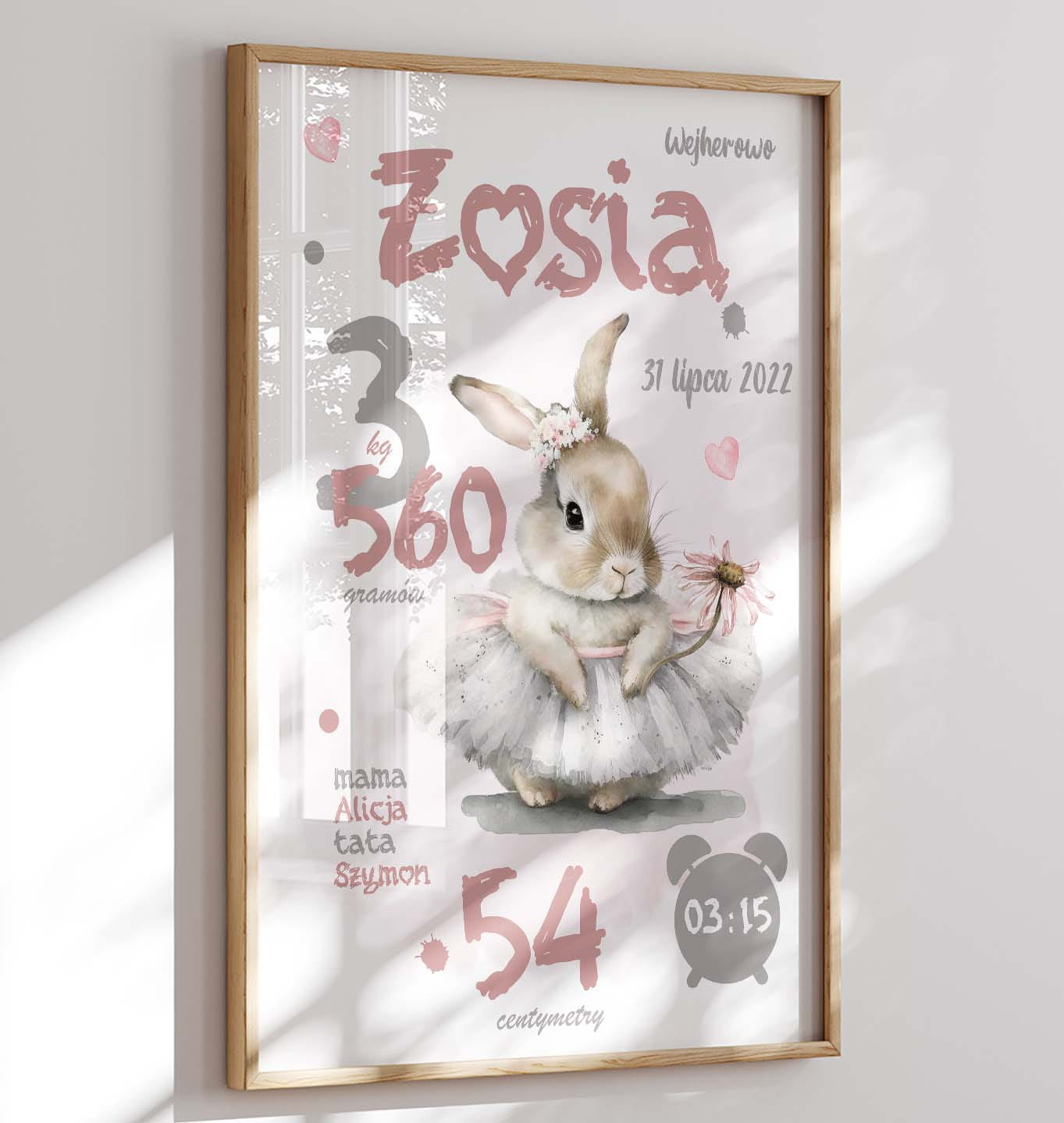 Personalizowana metryczka z uroczym króliczkiem w tutu i kwiatkiem. Idealna dekoracja do pokoju dziewczynki – piękny plakat z imieniem dziecka.