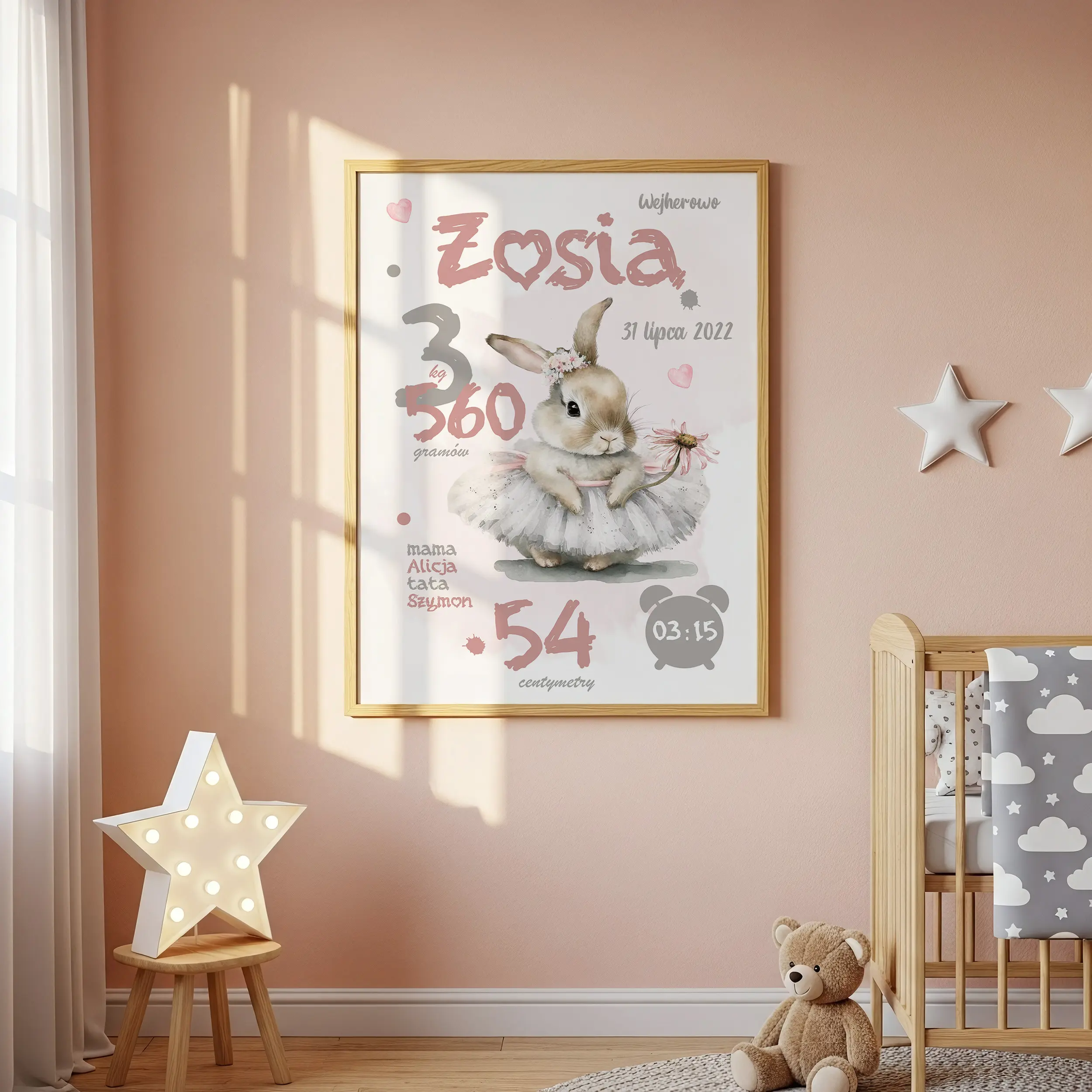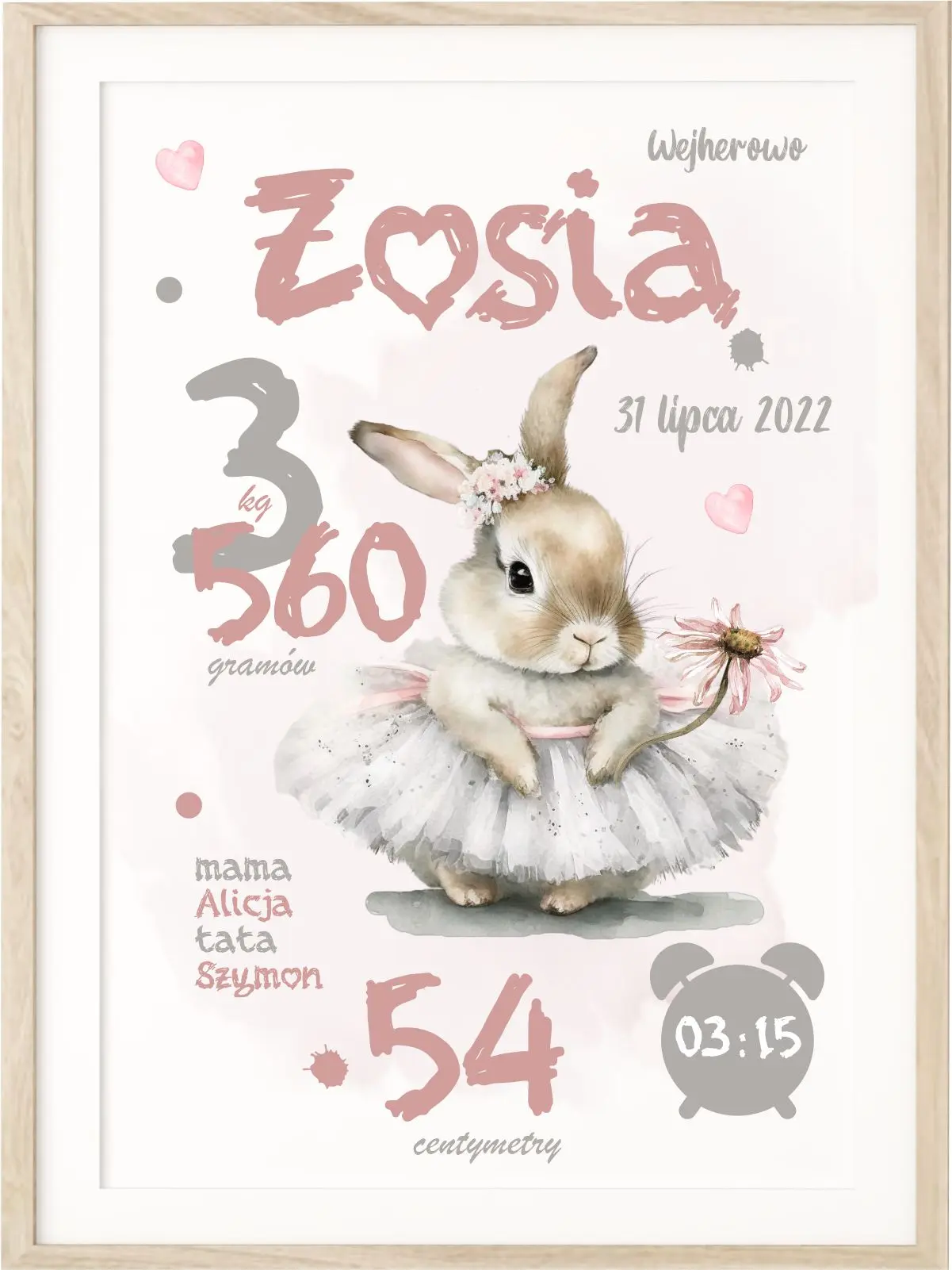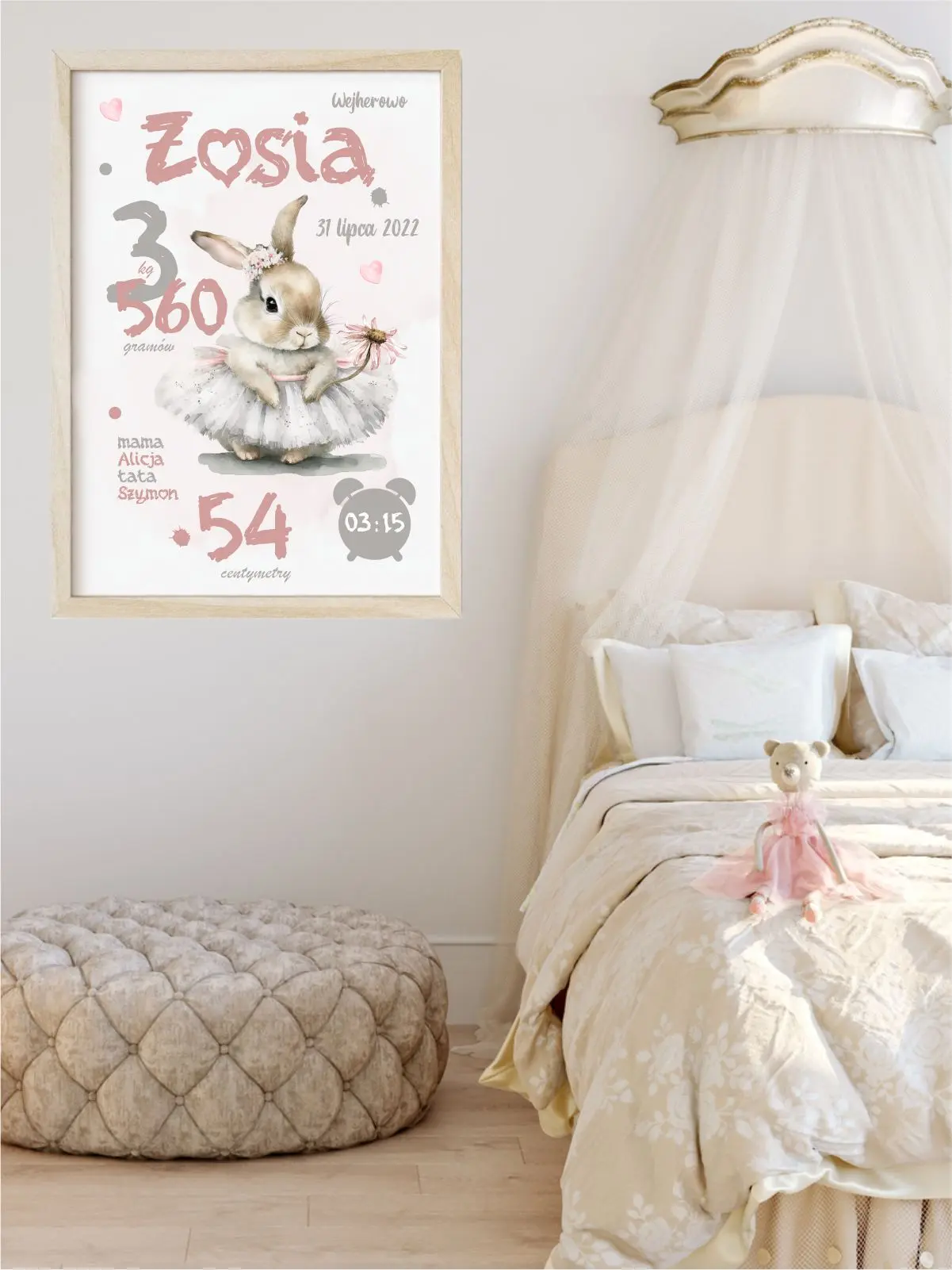 Personalizowana metryczka z uroczym króliczkiem w tutu i kwiatkiem. Idealna dekoracja do pokoju dziewczynki – piękny plakat z imieniem dziecka.