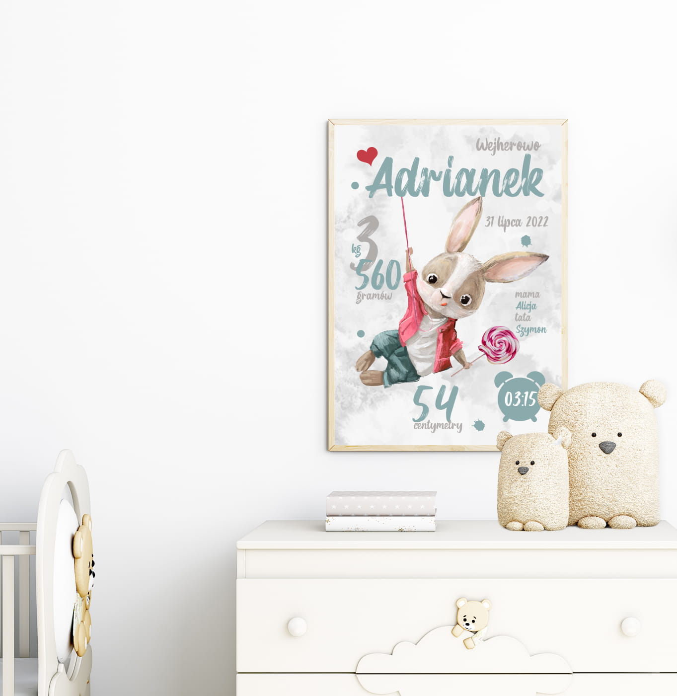 Metryczka – Króliczek z Lizakiem to urocza propozycja dekoracji ściennej do pokoju maluszka. Plakat przedstawia pastelowego króliczka trzymającego lizaka – delikatna kolorystyka oraz spokojna kompozycja sprawiają, że idealnie wpisuje się w styl pokoju niemowlęcia lub przedszkolaka. Personalizacja metryczki (imię dziecka, data, godzina, waga, wzrost) pozwala stworzyć wyjątkową pamiątkę narodzin. Plakat można powiesić nad łóżeczkiem, przewijakiem lub w kąciku zabaw – w każdej aranżacji będzie wyglądał pięknie i subtelnie.