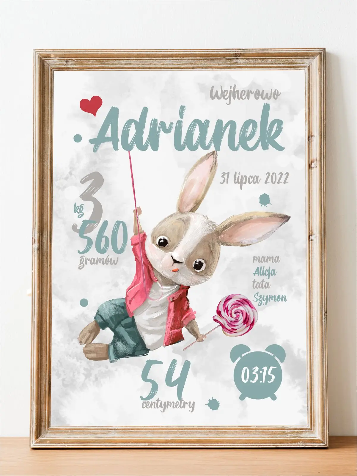Metryczka – Króliczek z Lizakiem to personalizowany plakat z imieniem dziecka, idealny do pokoju chłopca.