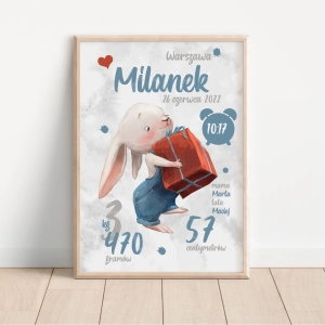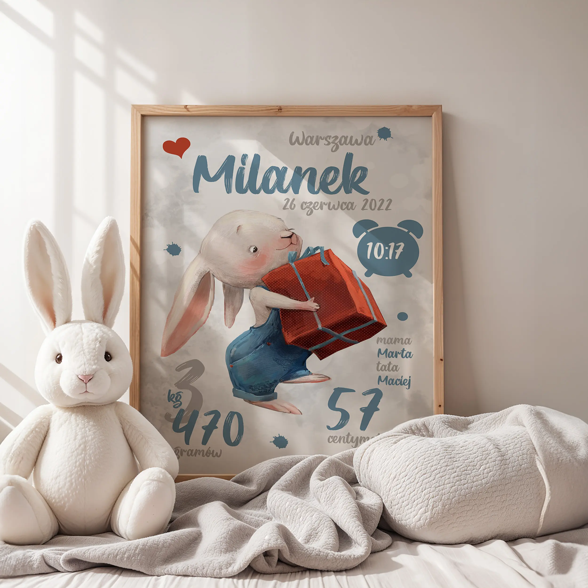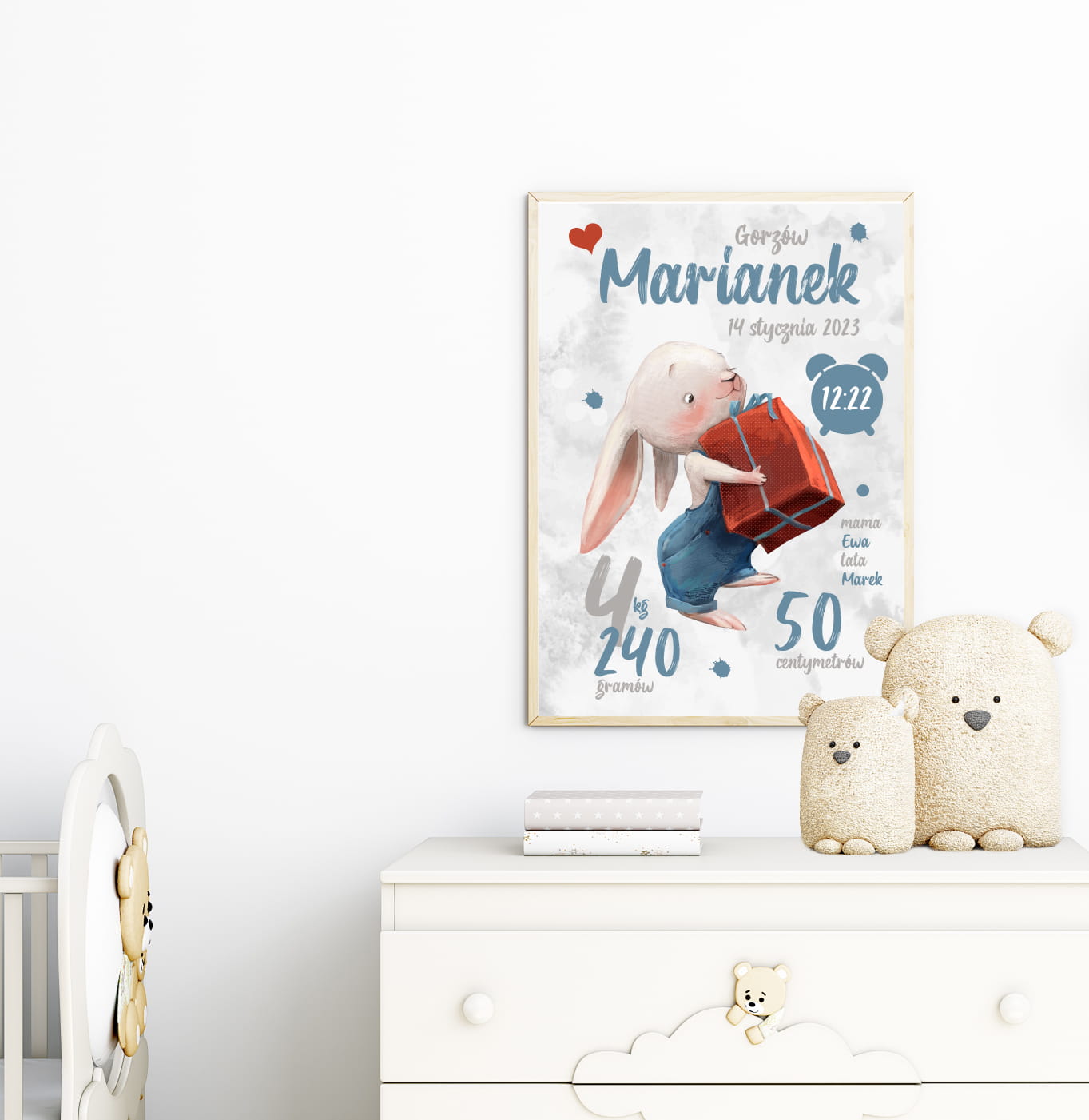 Uroczy plakat z króliczkiem niosącym prezent, z możliwością personalizacji imienia i danych narodzin. Idealna dekoracja do pokoju chłopca.