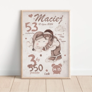 Personalizowana metryczka to wyjątkowa dekoracja na ścianę i wzruszająca pamiątka z dnia narodzin dziecka. Idealna na prezent, dostępna również w zestawie z pasującymi plakatami i naklejkami.
