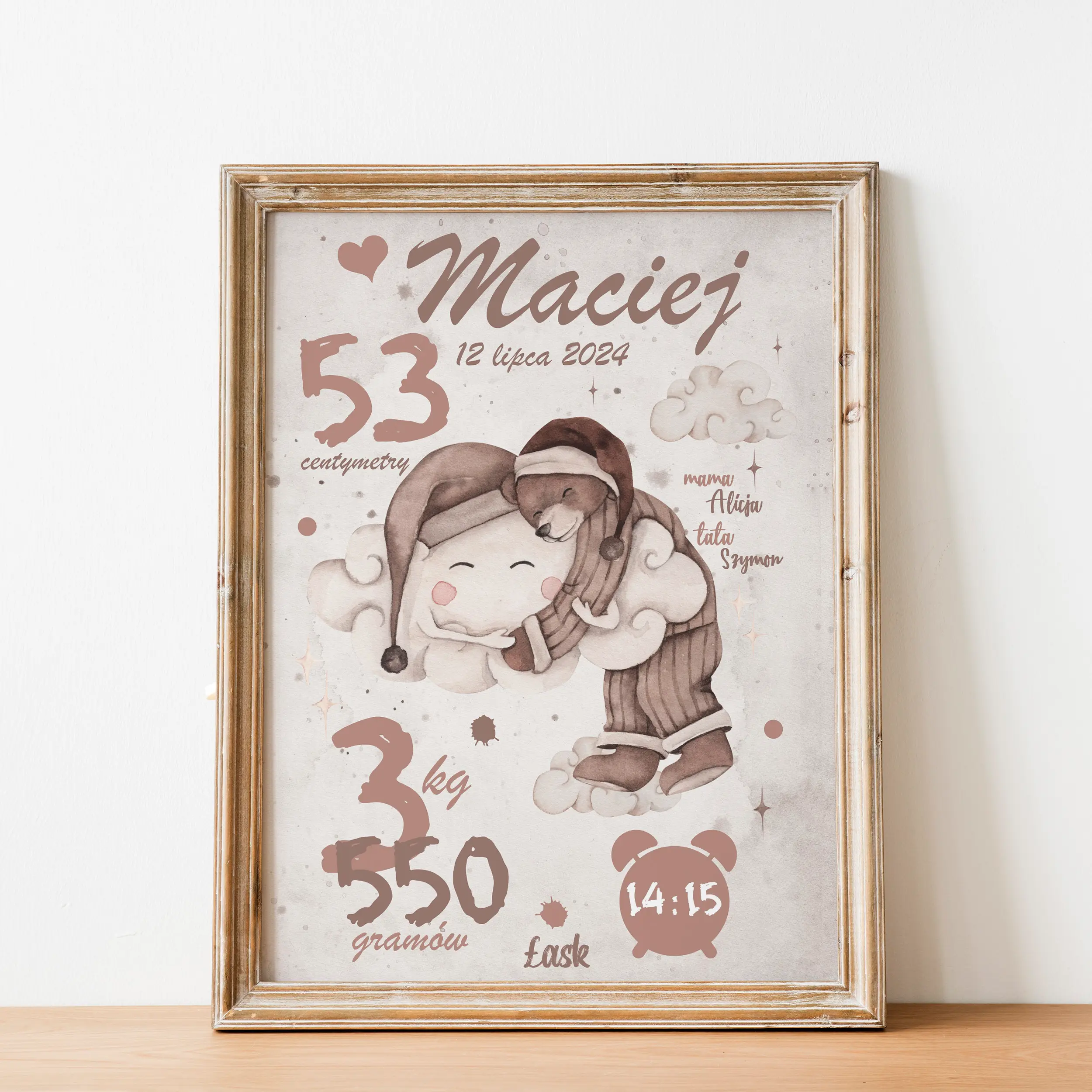 Personalizowana metryczka Miś z Chmurką to urocza dekoracja na ścianę i ponadczasowa pamiątka z dnia narodzin. Idealny prezent dla rodziców, którzy kochają delikatny, retro klimat i dodatki z duszą.