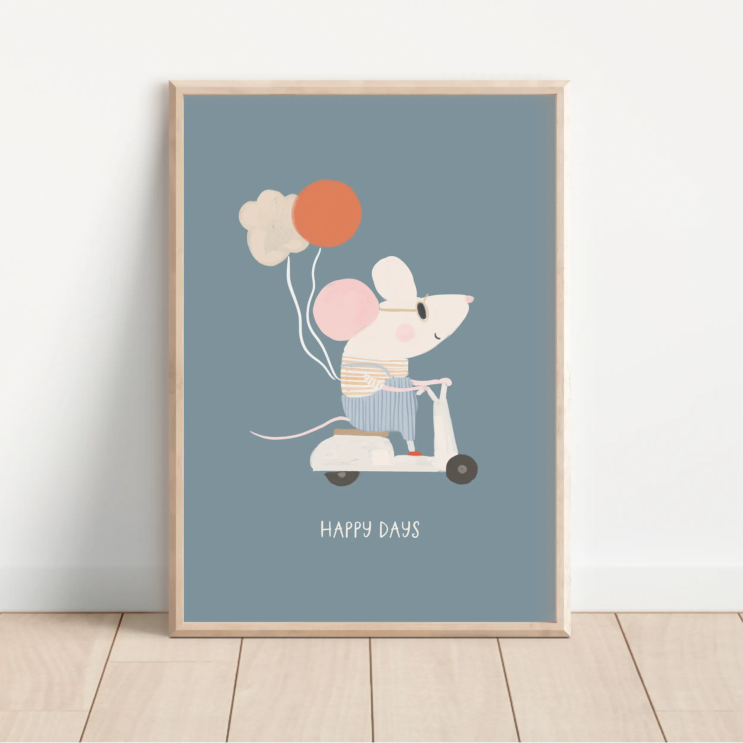 Ten uroczy plakat z myszką na hulajnodze pochodzi z naszej kolekcji zaprojektowanej specjalnie dla najmłodszych — pełnej delikatnych motywów i pastelowych barw. Myszka emanuje radością i beztroską, jakby zapraszała do wspólnej zabawy i przygody. Dzięki subtelnemu designowi i miękkiej kolorystyce, plakat pięknie komponuje się z wnętrzem pokoju dziecięcego, nadając mu przytulny i inspirujący charakter.