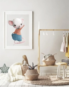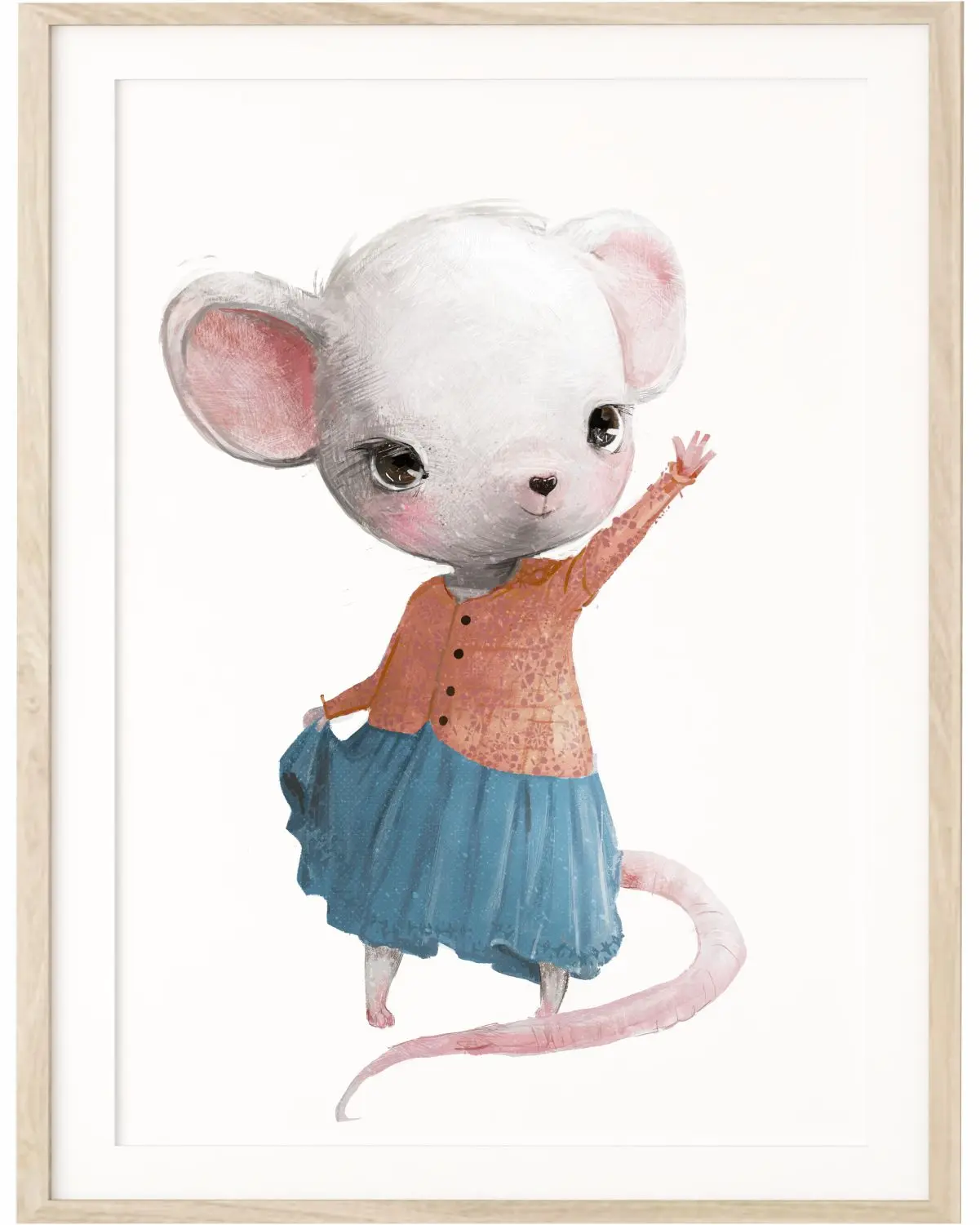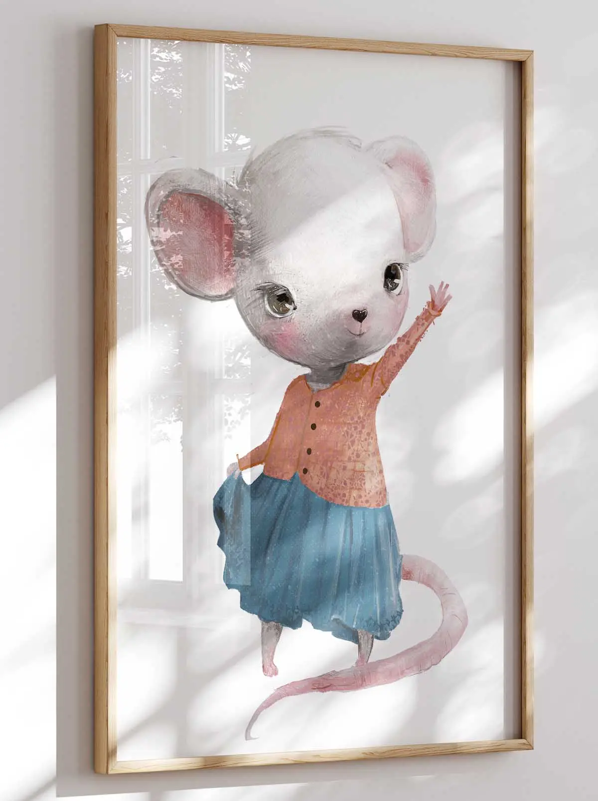 Plakat z uroczą myszką w spódniczce i sweterku. Delikatna, pastelowa ilustracja idealna do pokoju dziewczynki.
