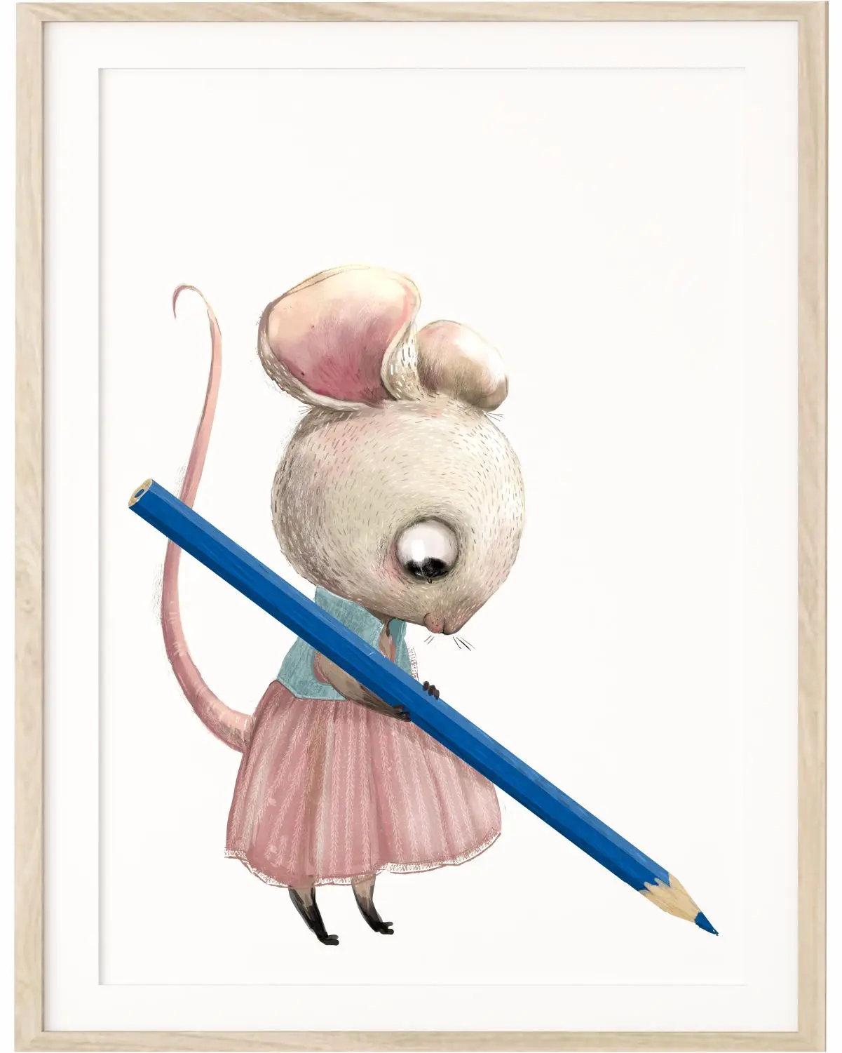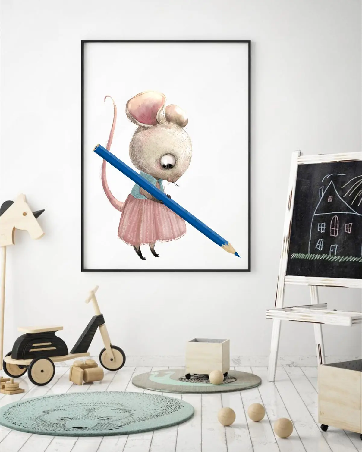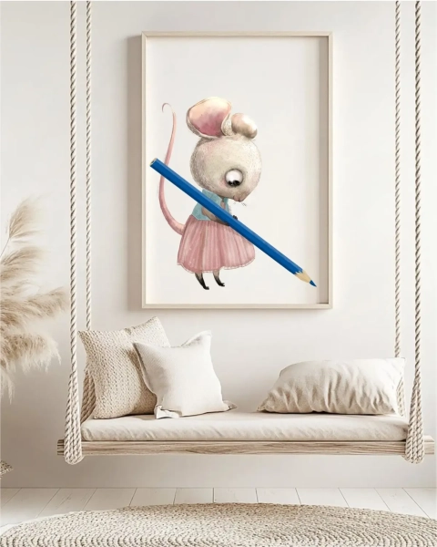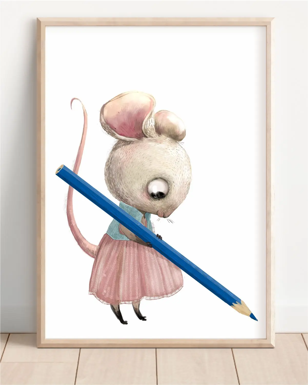 Pastelowa myszka w spódniczce i sweterku z niebieskim ołówkiem to nie tylko urocza dekoracja, ale także inspiracja do nauki. Ilustracja z kolekcji Pastelowe Zwierzęta świetnie sprawdzi się jako plakat edukacyjny do pokoju dziecka.