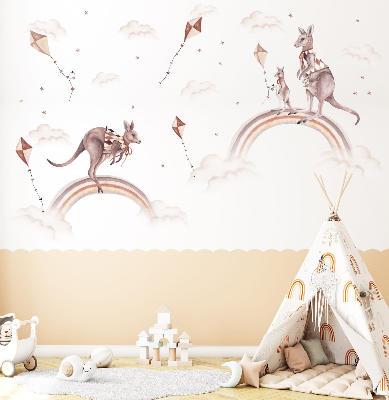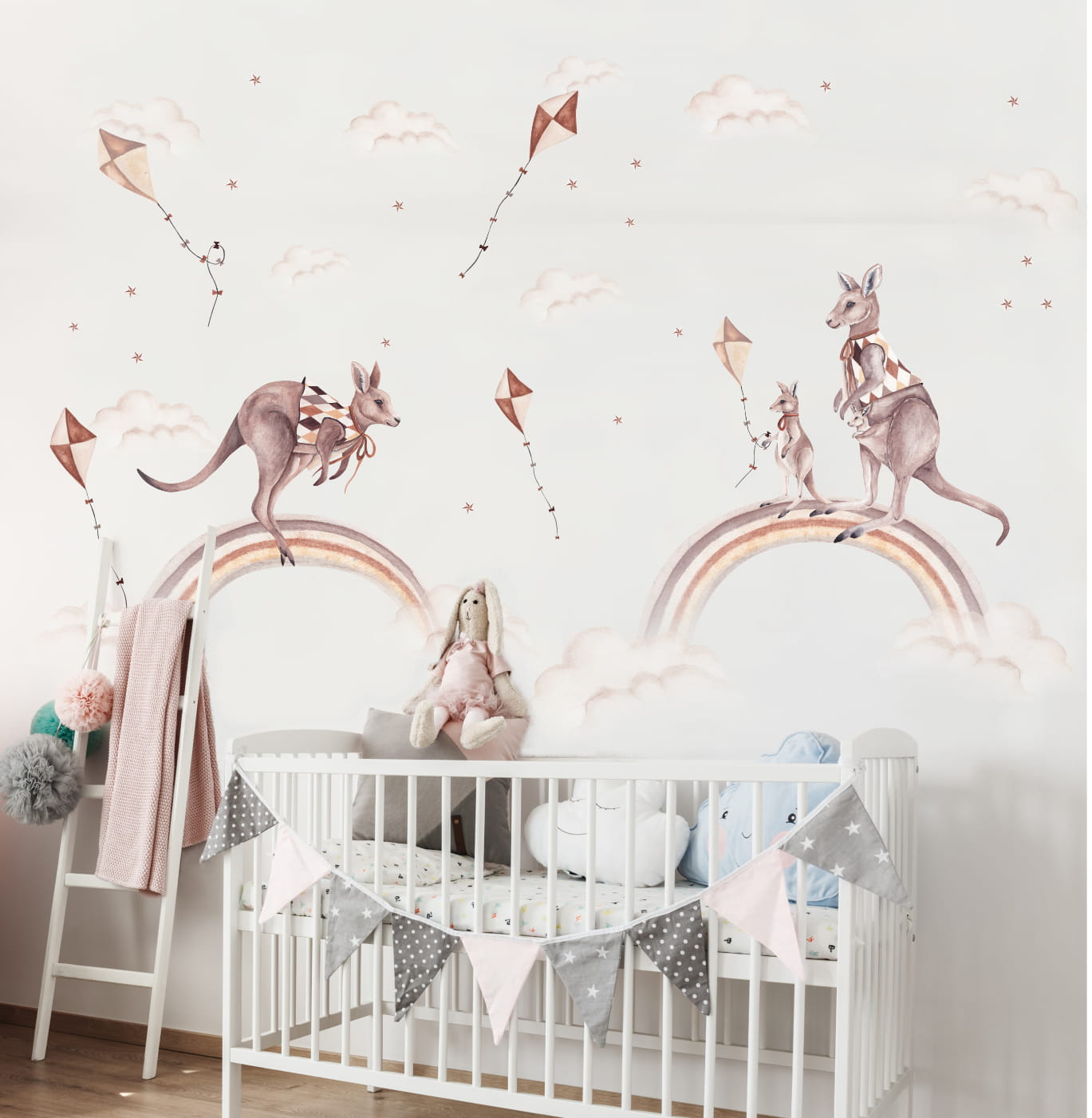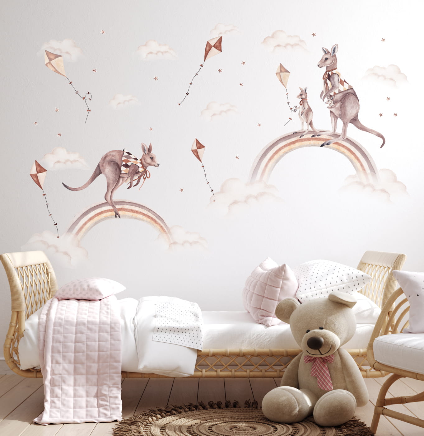 Naklejka na ścianę Kangurki, Tęcza, Latawce to wyjątkowa dekoracja, która wprowadzi do pokoju dziecka przytulny klimat. Jej subtelne, pastelowe barwy doskonale komponują się z drewnianymi meblami, naturalnymi dodatkami i wystrojem w stylu vintage.