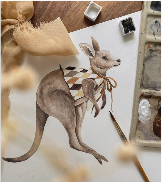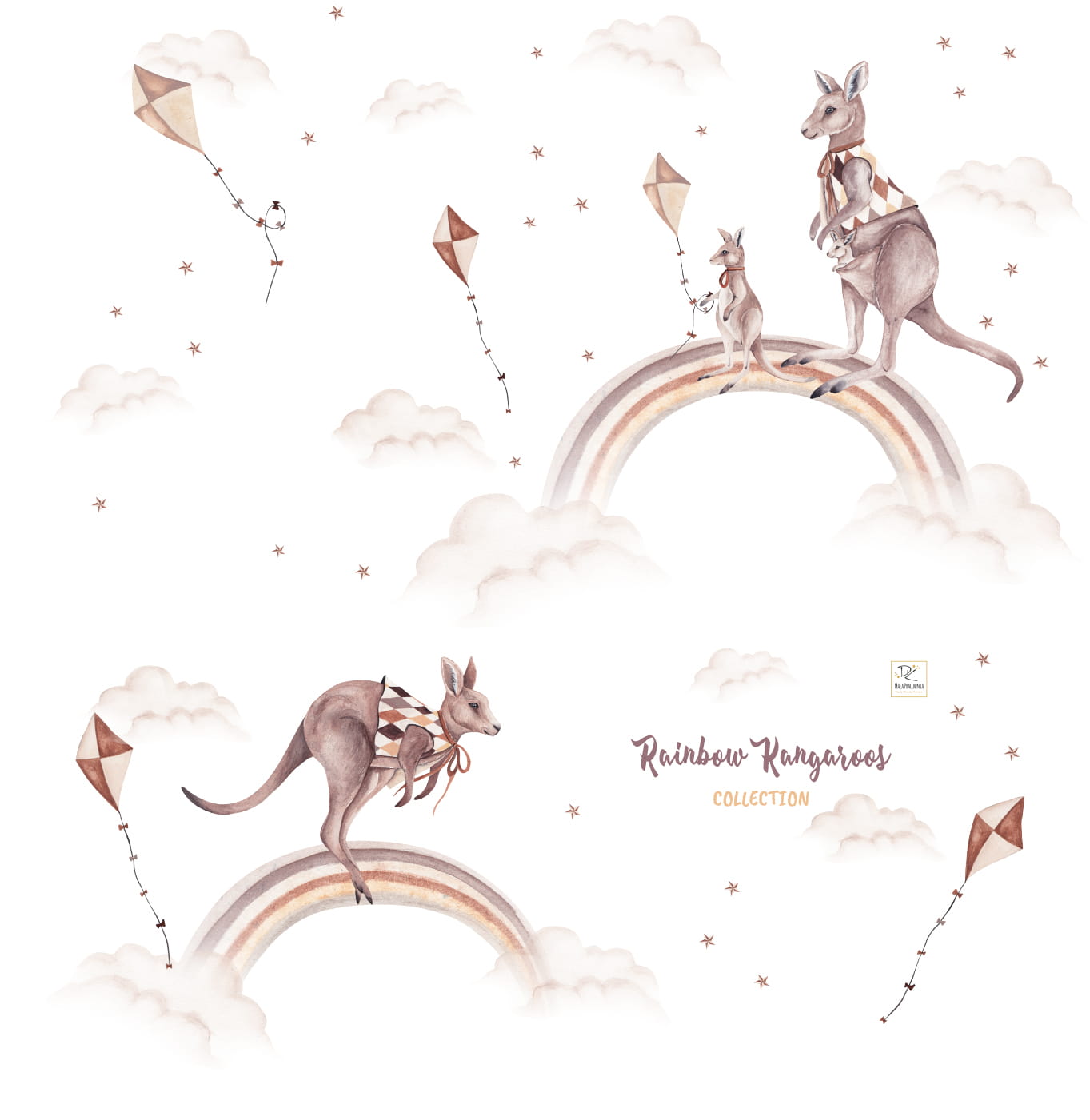 Gdzieś wysoko, wśród chmurek lekkich jak obłoczki, rozciągają się dwie tęcze w ciepłych odcieniach beżu i brązu. Na jednej z nich stoi mama kangurzyca, a obok niej mały kangurek – trzyma w łapce balonik i z podziwem spogląda na tatę. A tata? Właśnie susa (bo przecież kangury susają!) po drugiej tęczy, jakby unosił się w powietrzu! Dookoła wirują delikatne latawce i gwiazdki, nadając całej scenie magiczny, bajkowy nastrój.