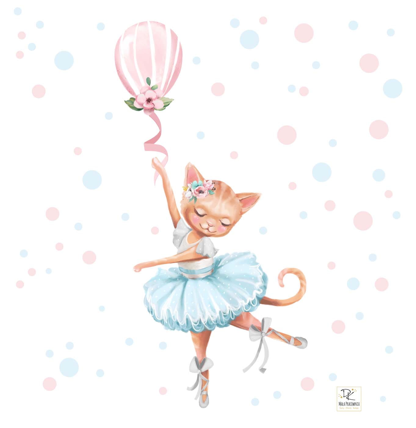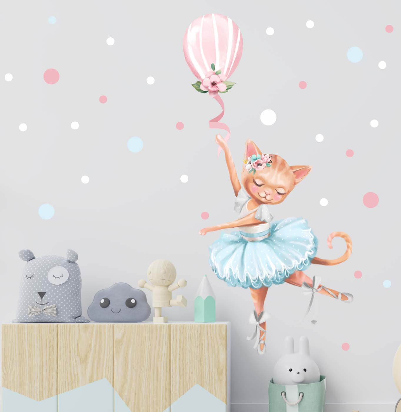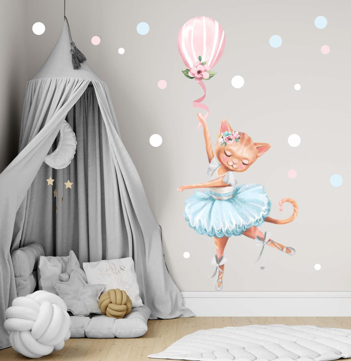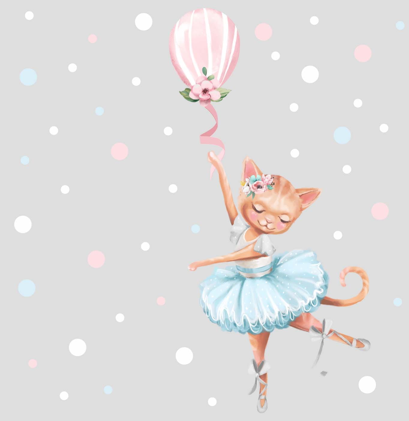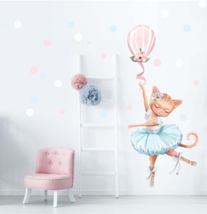 Balet to nie tylko taniec, to marzenie, magia i świat pełen gracji – właśnie dlatego dziewczynki go uwielbiają! Nasza urocza naklejka przedstawia kotka baletnicę trzymającego balonik, który zdaje się unosić go w lekkim piruecie. Ta subtelna dekoracja wprowadzi do pokoju dziecka odrobinę delikatności i bajkowego uroku.