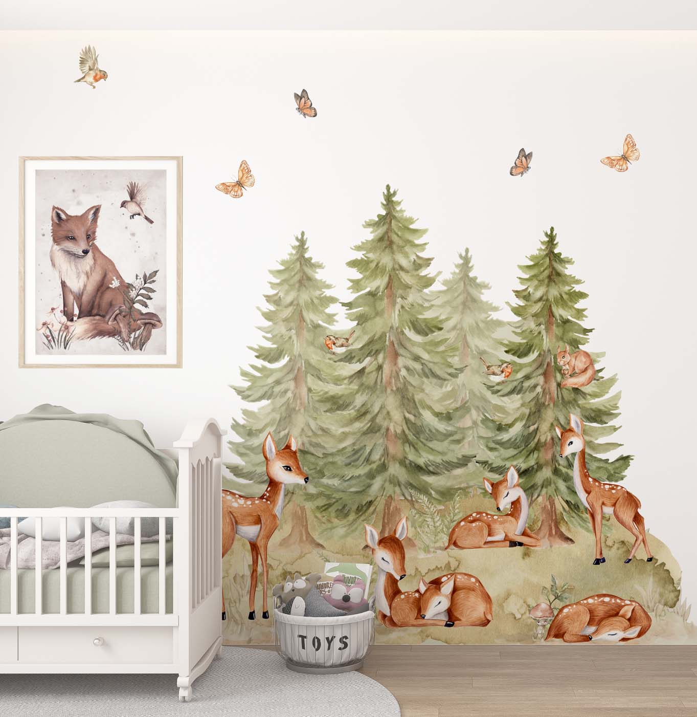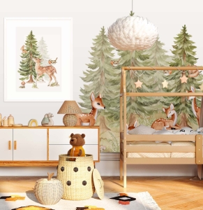 Taka dekoracja pięknie wygląda za łóżkiem, w kąciku do czytania lub w miejscu zabaw — gdzie zamienia zwykłą ścianę w leśny zakątek. Pastelowe odcienie i delikatna akwarelowa kreska tworzą przyjazną przestrzeń, która pasuje zarówno do pokoju dziewczynki, jak i chłopca.