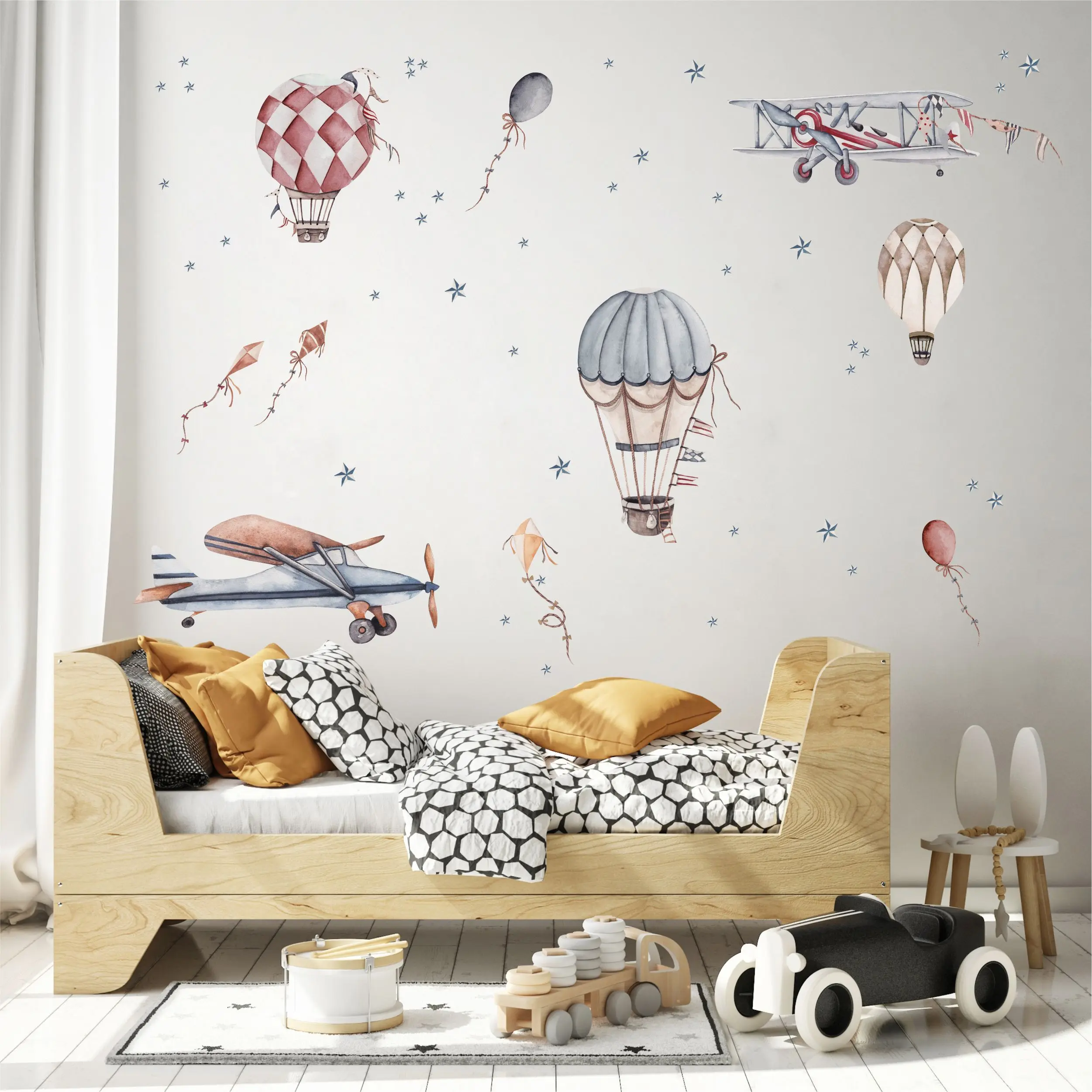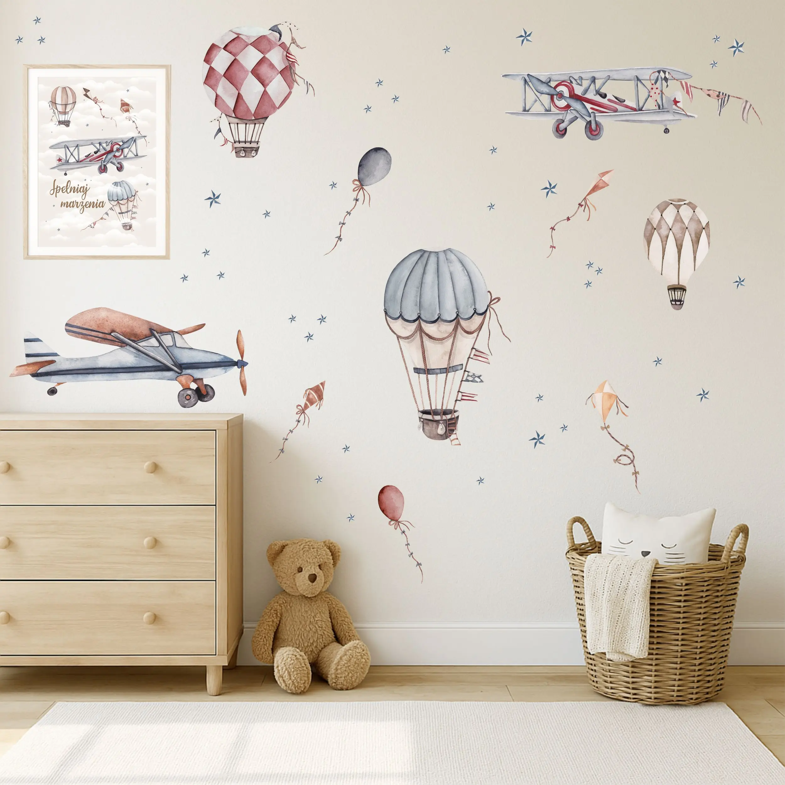Samoloty Retro – Naklejka na Ścianę (Zestaw 4) to element autorskiej serii Małej Pracowni. Motyw samolotów i balonów retro pasuje do pokoju chłopca i łatwo dopasować go do różnych aranżacji. Zestaw umożliwia swobodne rozmieszczenie elementów nad łóżkiem, biurkiem lub w strefie zabawy. Zestaw 4 dopełnia całą kolekcję i pozwala stworzyć spójną dekorację lotniczą.