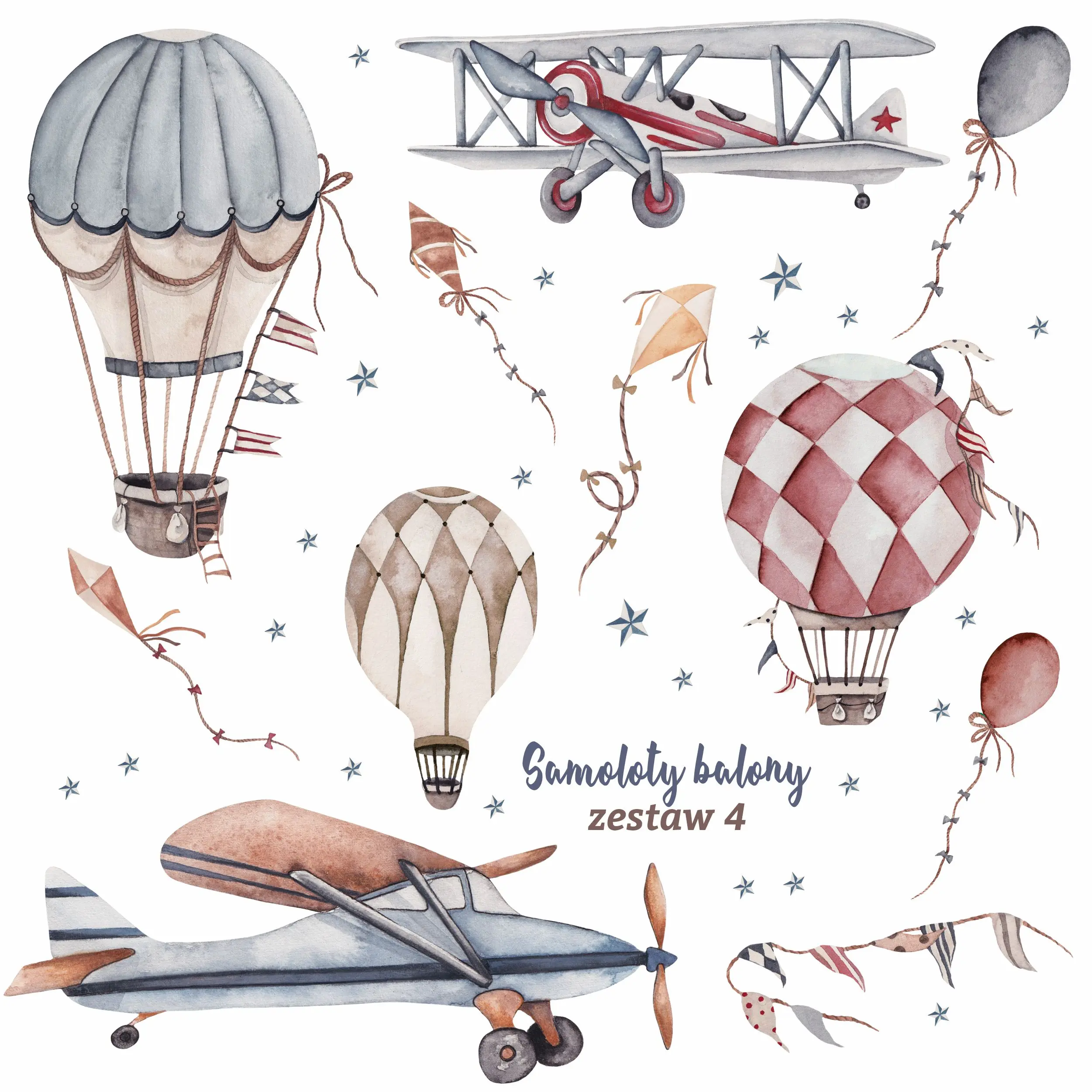Zestaw zawiera: samolot Nr.1 78 x 32cm, samolot Nr.2 64 x 24cm, balon Nr.1 63,5 x 41cm, balon Nr.2 37 x 45cm, balon Nr.3 22 x 37cm, balonik mały 33 x 8cm, 40 x10cm, latawiec Nr.1 36 x 8cm, latawiec Nr.2 36 x 16cm, latawiec Nr.3 14 x 30cm, chorągiewka 40 x 13cm, gwiazdki 2 - 5cm x 38szt