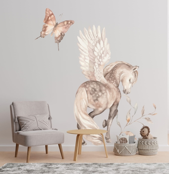 Baśń o Skrzydlatym Rumaku – Motyl – Naklejka to akwarelowa dekoracja, która wprowadza baśniowy klimat do pokoju dziewczynki. Motyw skrzydlatego rumaka w towarzystwie delikatnego motyla stworzy magiczną atmosferę, idealną do stworzenia przestrzeni pełnej marzeń i fantazji. Nasza naklejka doskonale pasuje do pokoju małej marzycielki, dodając mu uroku i ciepła. Dzięki wysokiej jakości materiałowi jest łatwa w aplikacji i pozostaje trwała przez długi czas.
