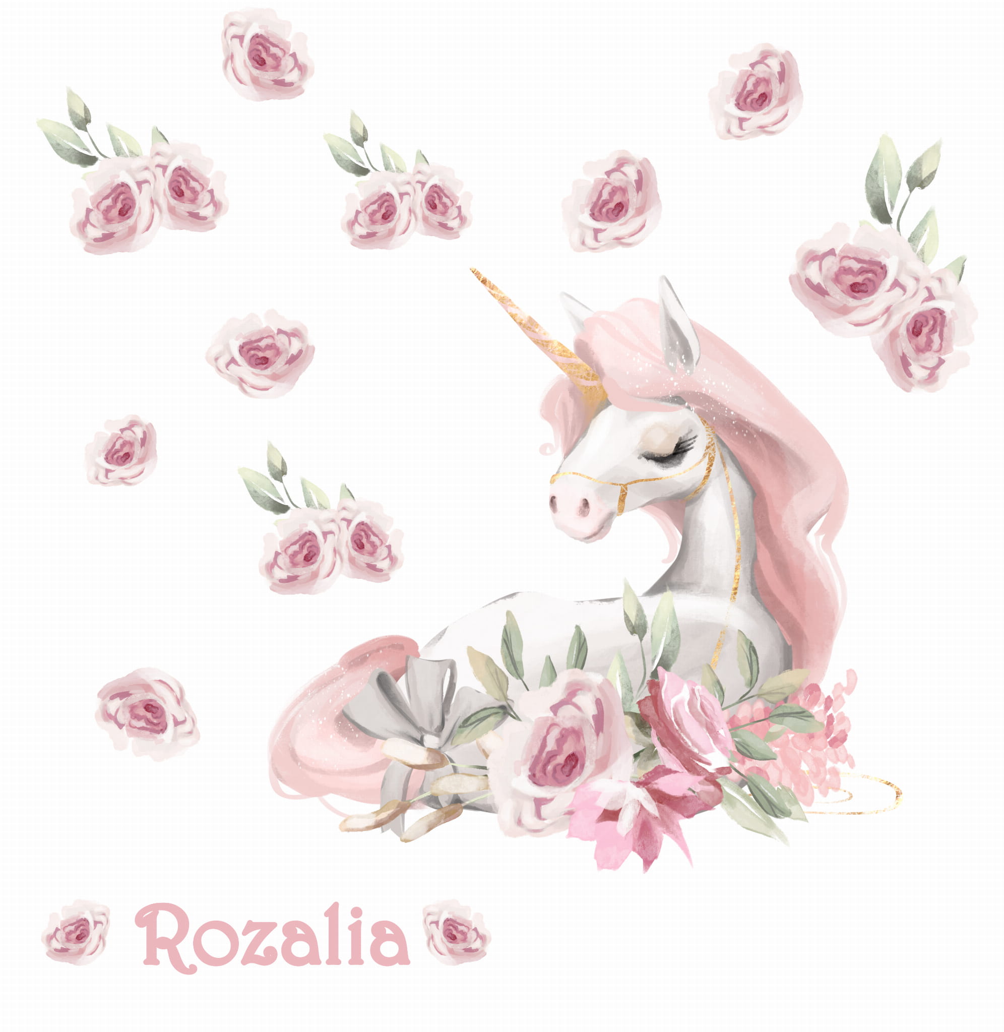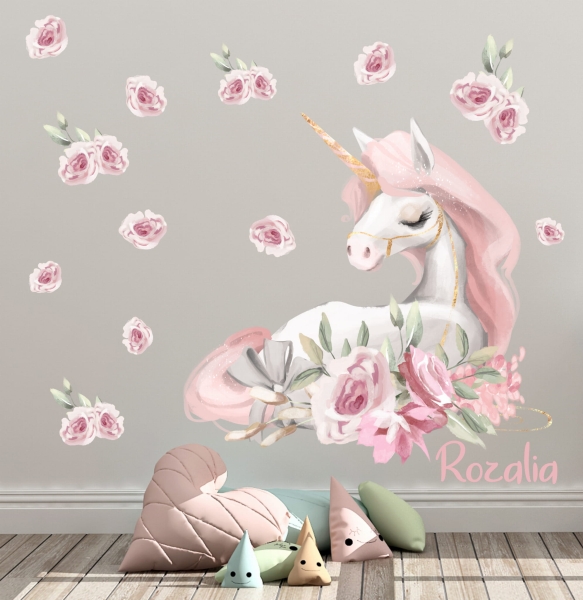 Jednorożec, kwiaty, personalizacja-naklejka na ścianę