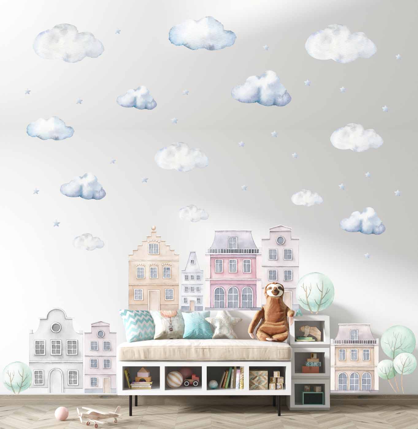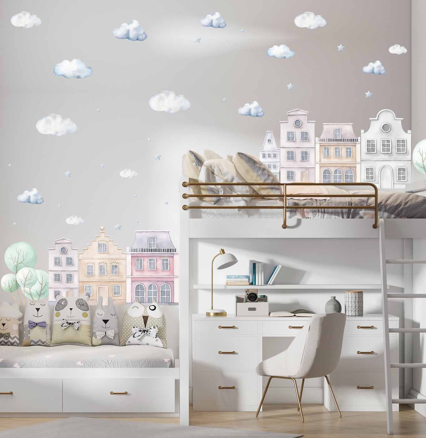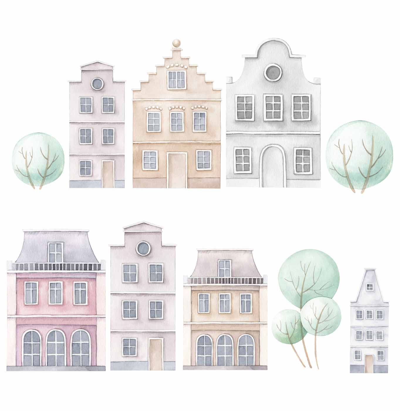Kamieniczki, pastelowe domki, drzewa | Naklejka na ścianę dla dzieci
