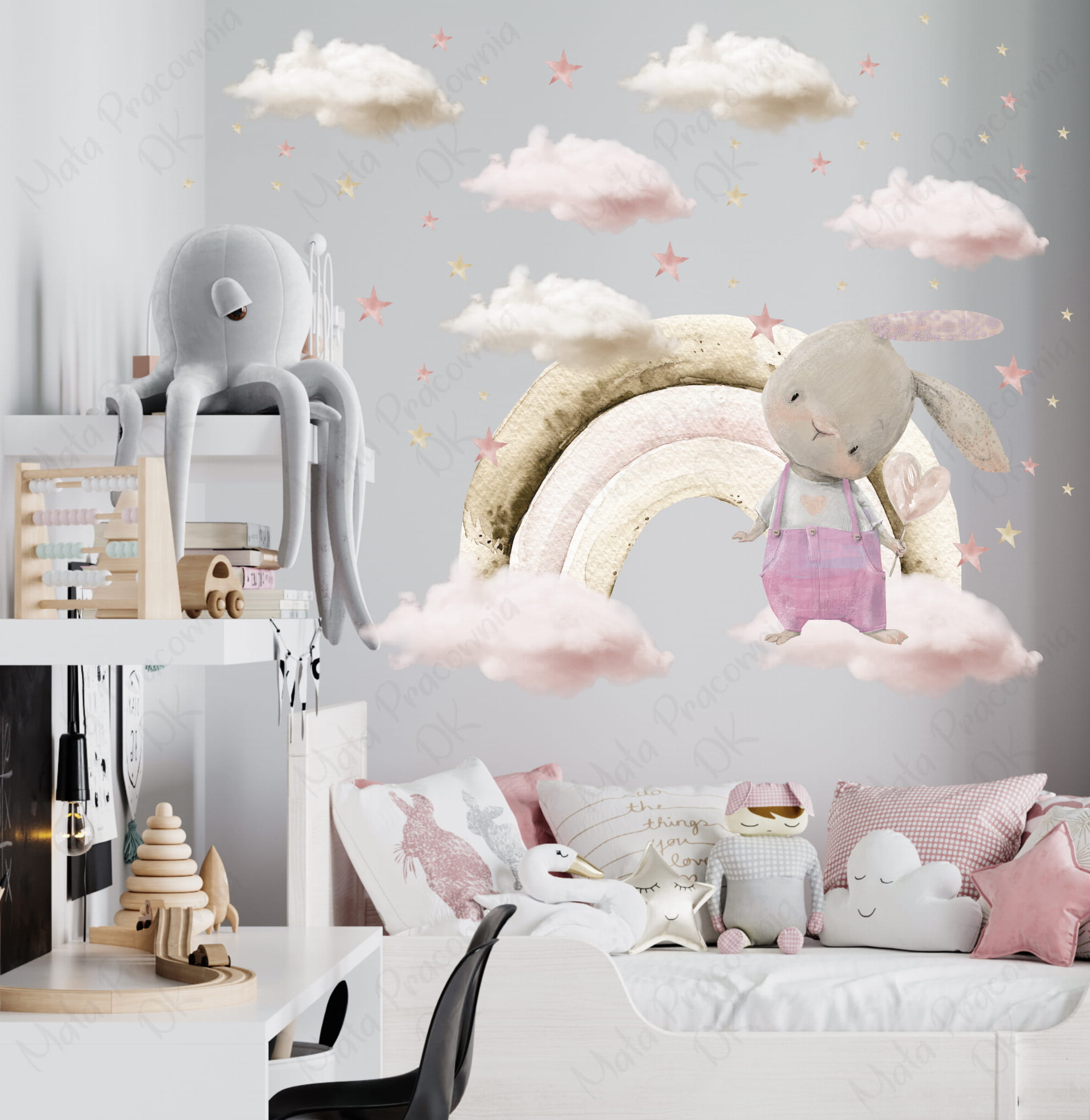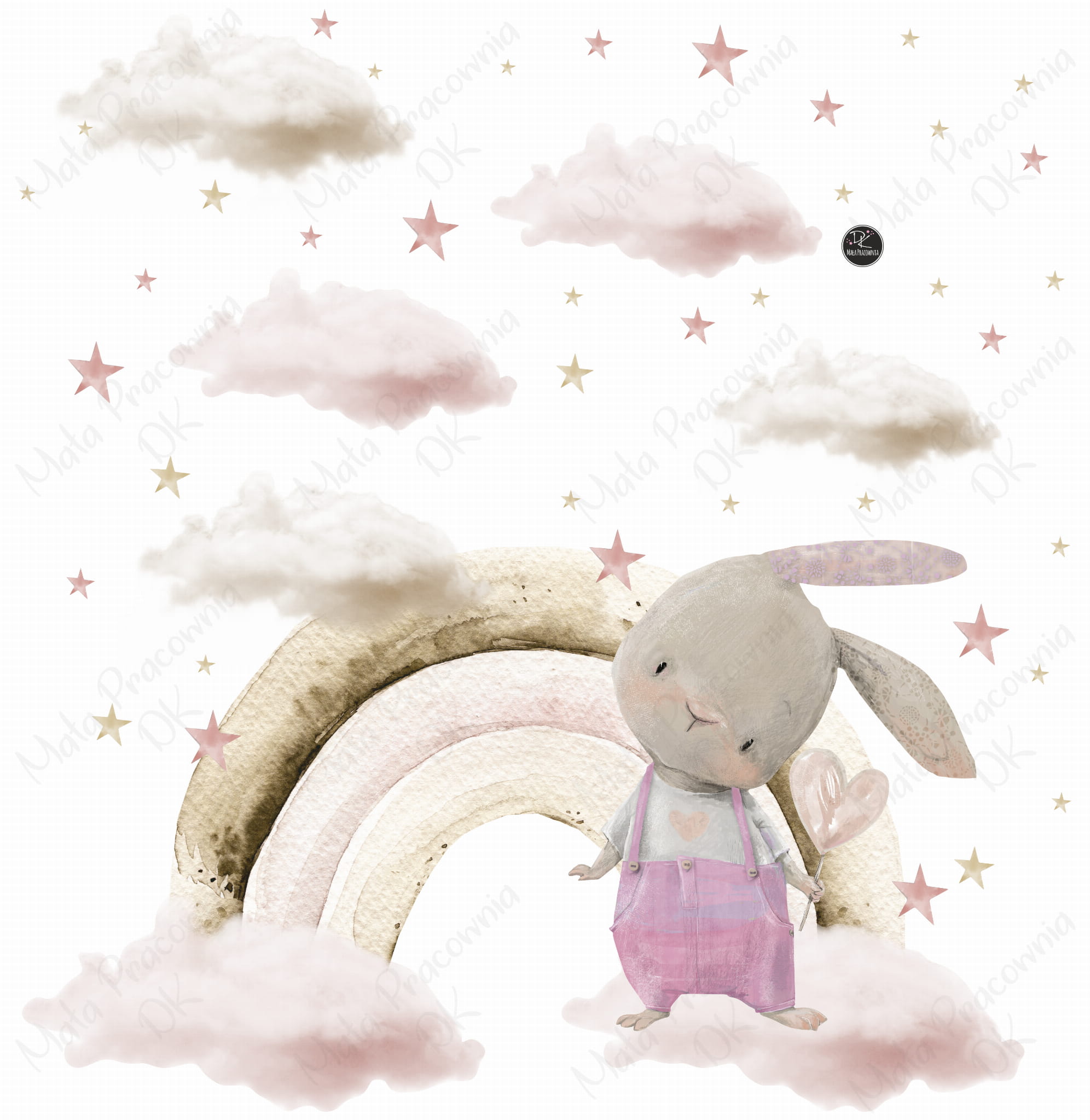 Zestaw zawiera: chmurki 29-50cm x 5szt, króliczek na tęczy 111 x 63,5cm, gwiazdki 2-5cm x 84szt