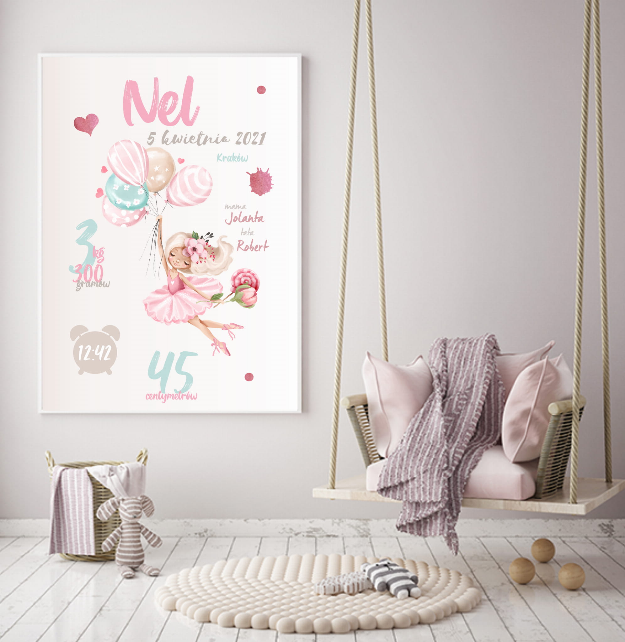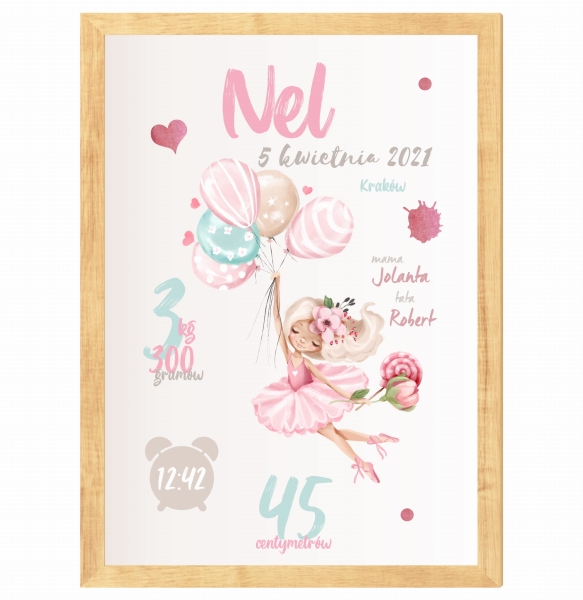 Metryczka baletnica, baloniki róż