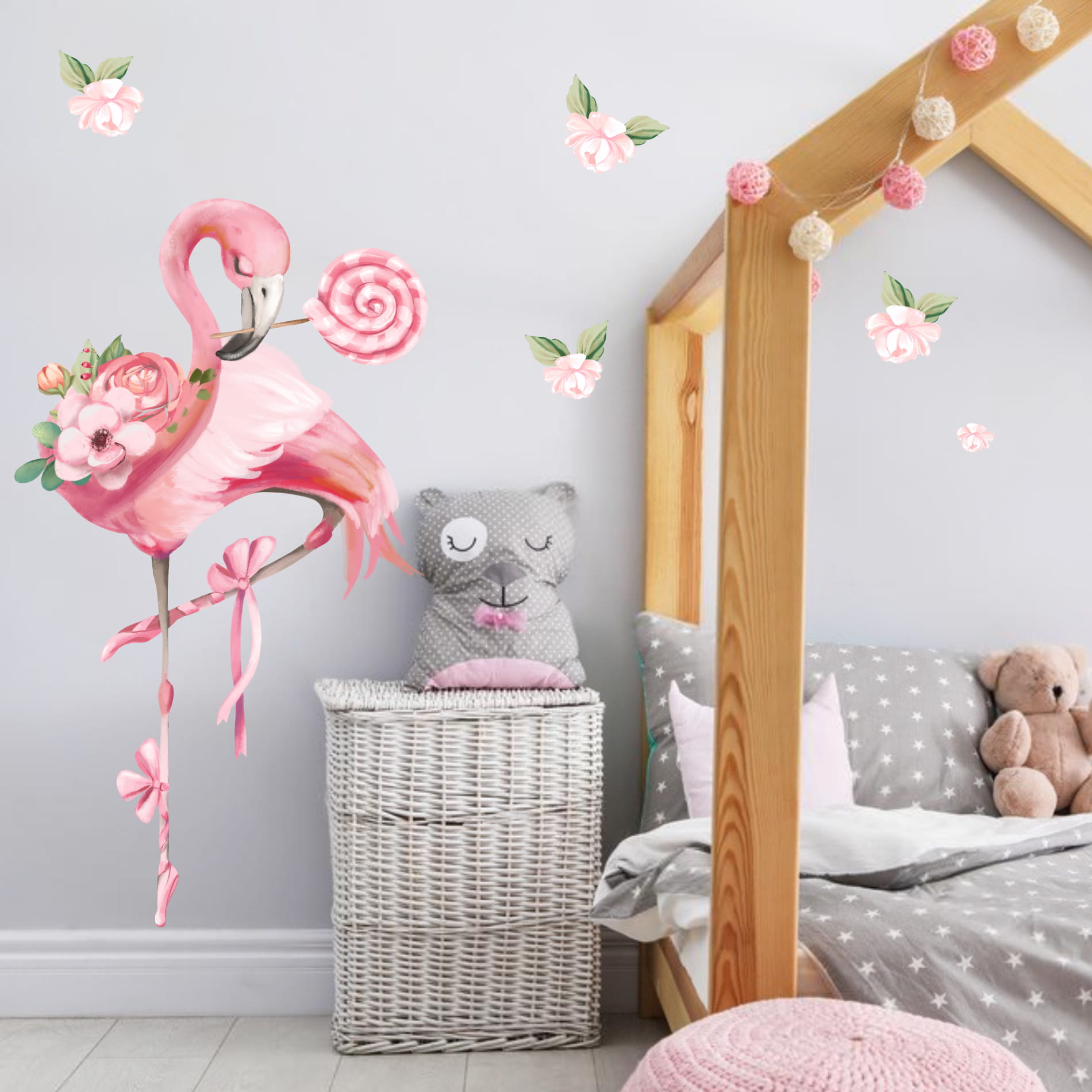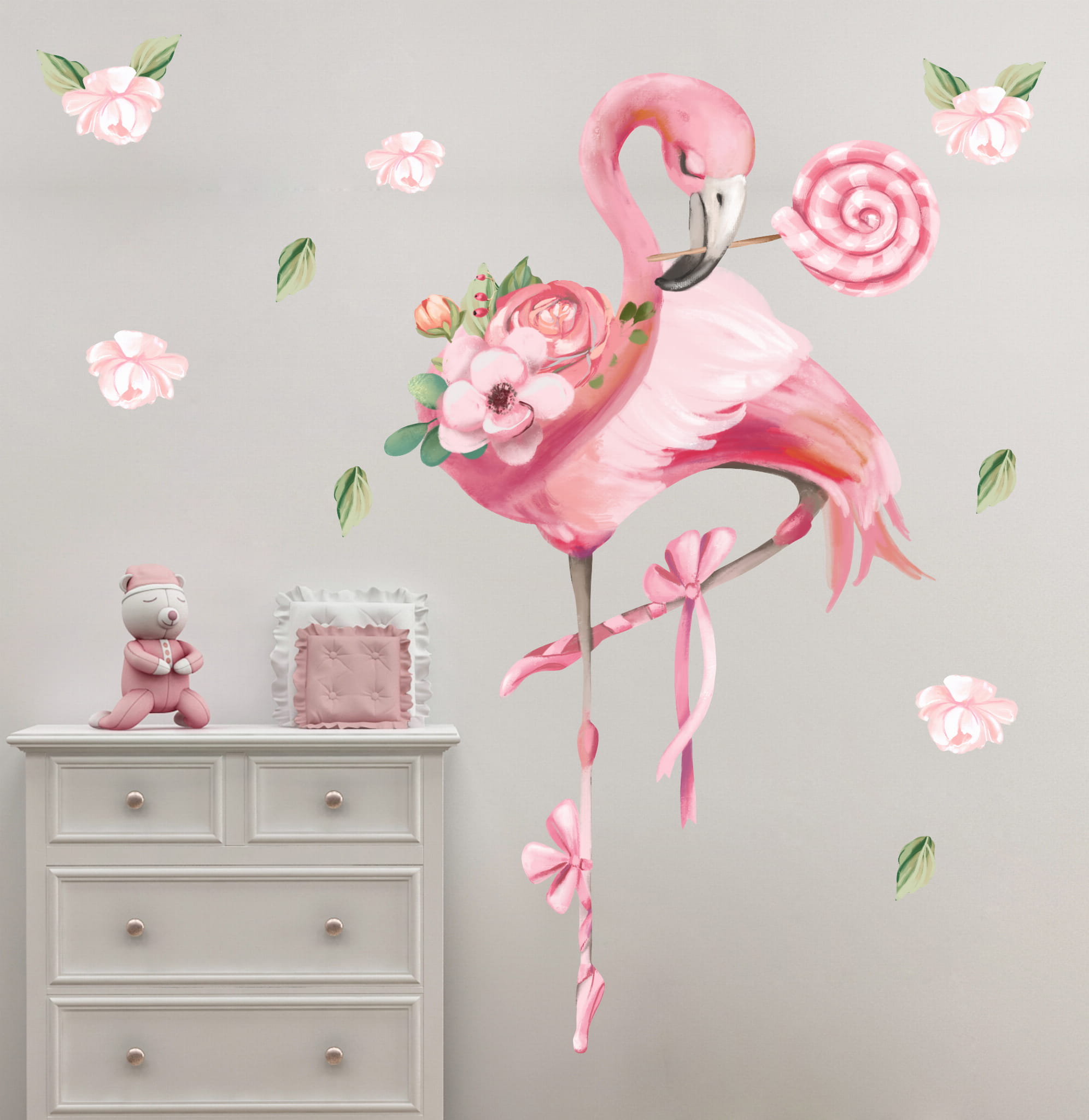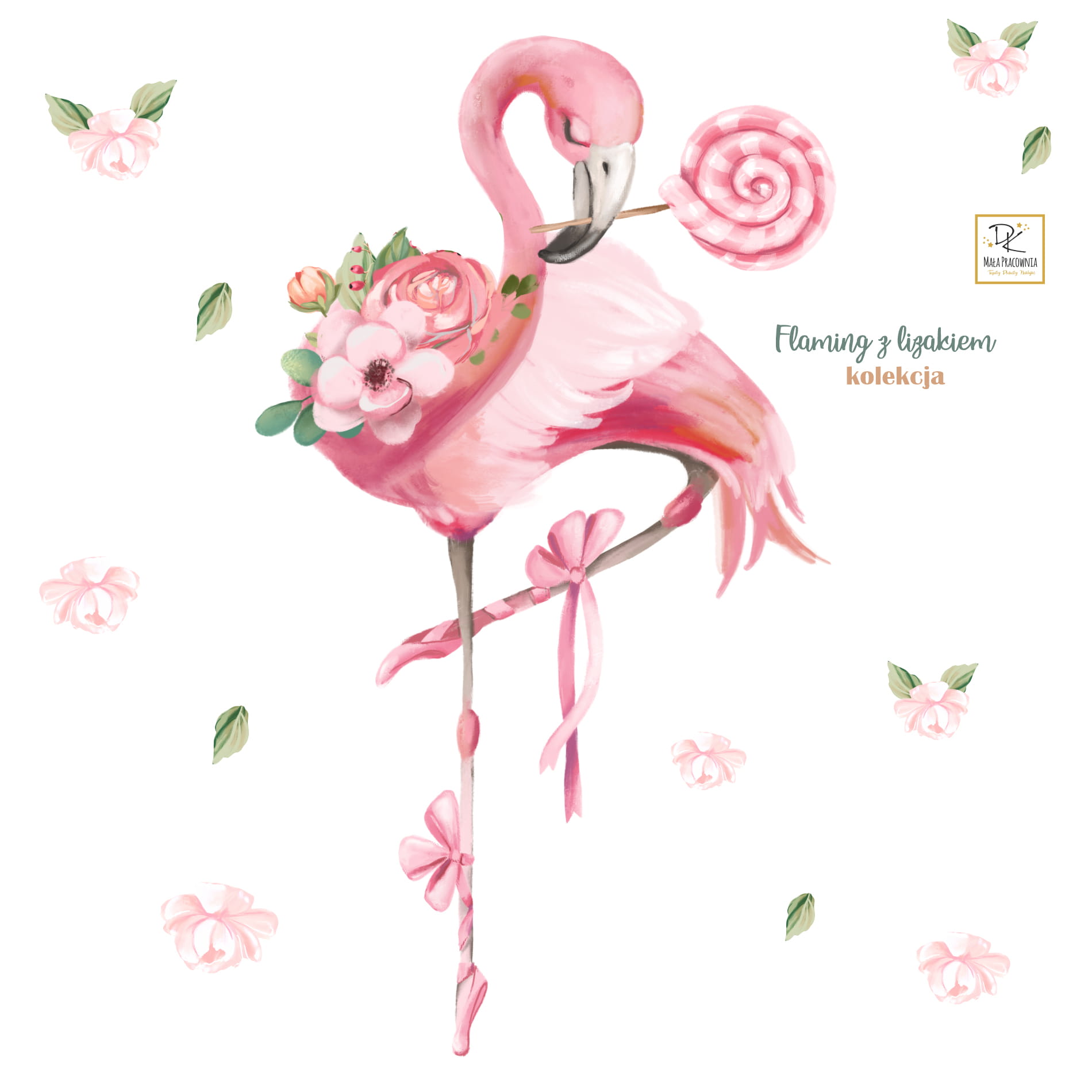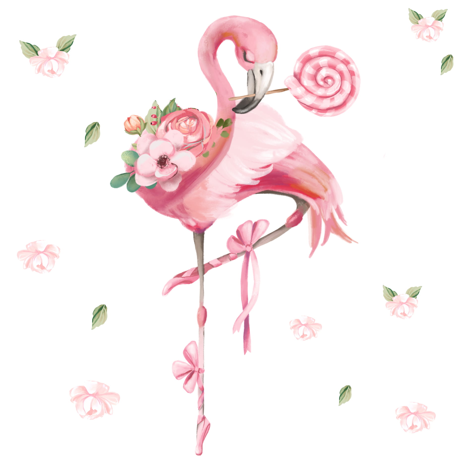 Flamingi to niezwykłe stworzenia – smukłe, eleganckie i pełne gracji. Nic dziwnego, że pokochały je małe baletnice! Nasza naklejka na ścianę z flamingiem przedstawia uroczego flaminga w baletkach, który niczym prawdziwa tancerka stąpa po delikatnych płatkach kwiatów. Jego różowe pióra mienią się niczym muślinowa spódniczka, a w dziobie dzierży kolorowy lizak – małą słodką tajemnicę, którą skrywa w świecie dziecięcej fantazji.