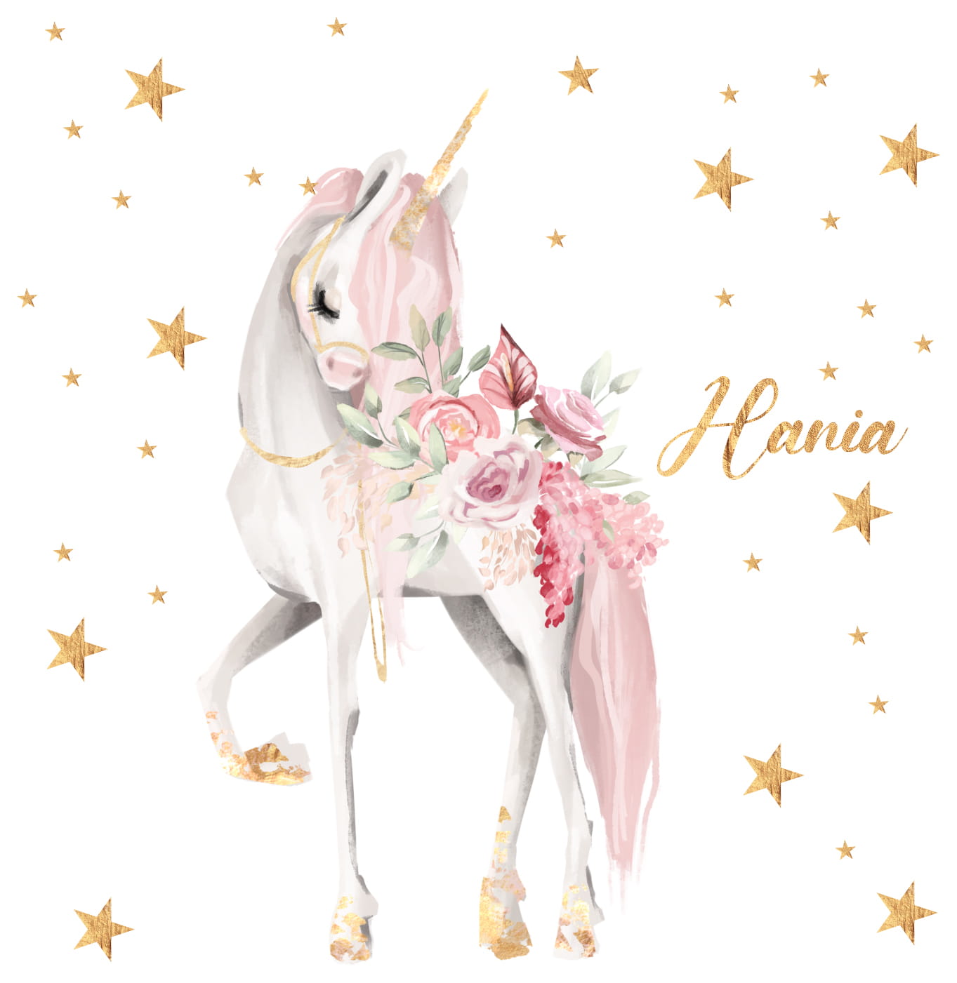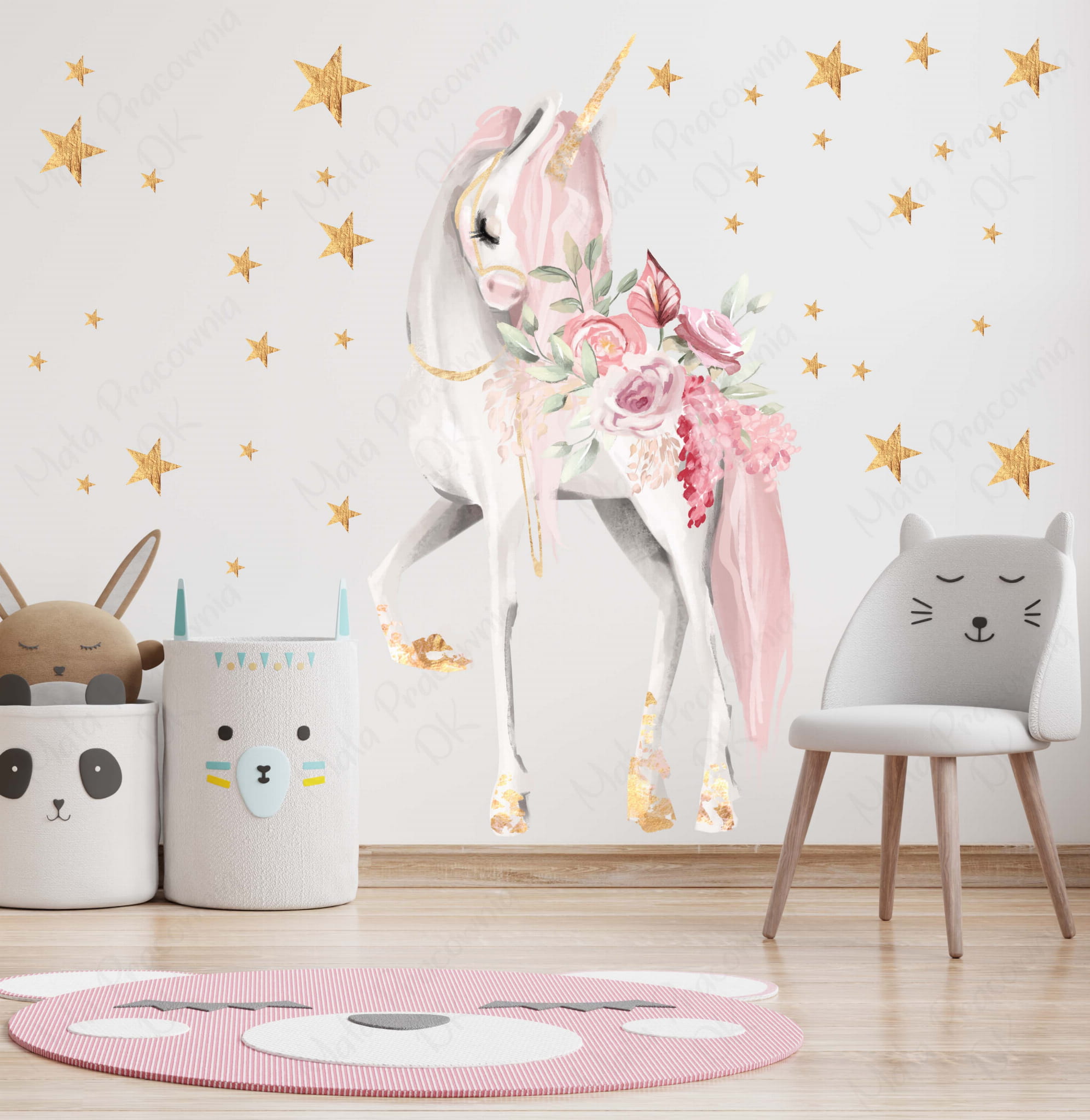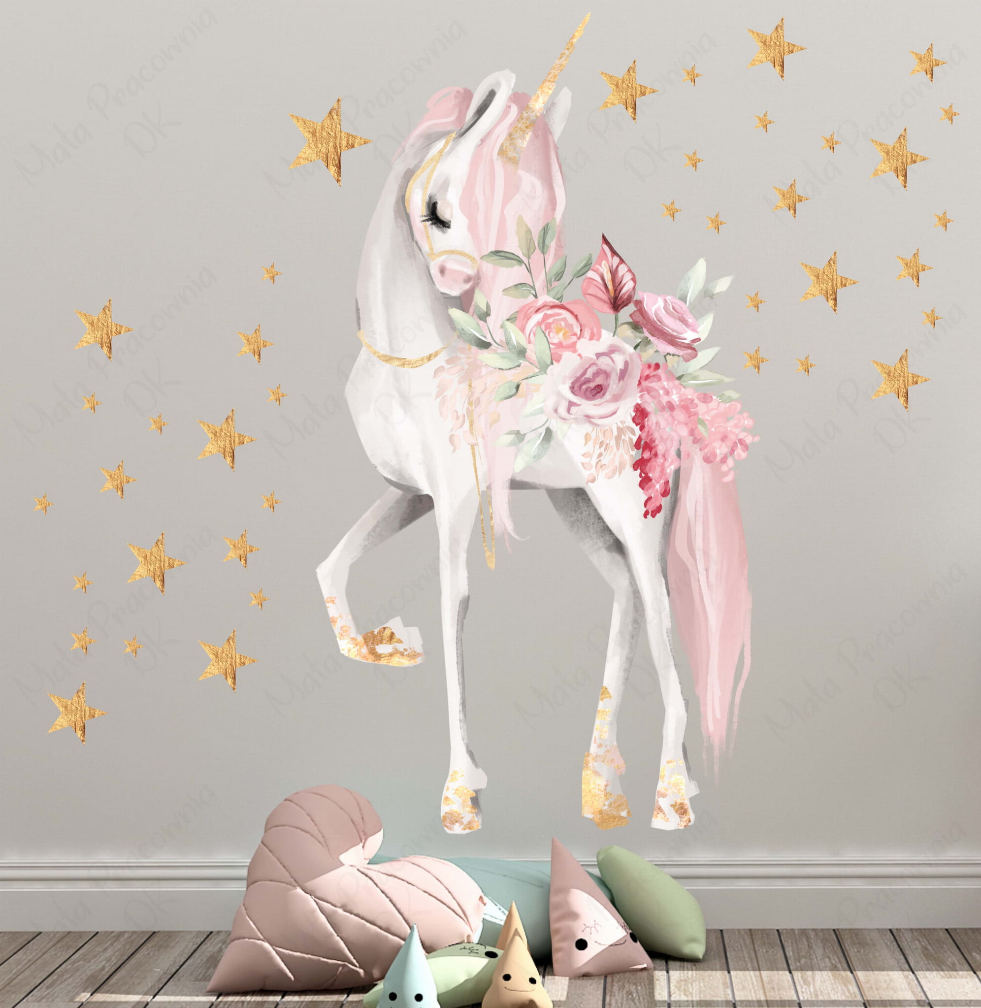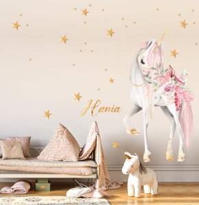 Możliwa personalizacja. Po zakupie proszę w uwagach podać imię dziecka. Komplet może być wykonany w odbiciu lustrzanym (jednorożec w drugą stronę). Po zakupie proszę w uwagach wpisać „naklejka w odbiciu lustrzanym”.