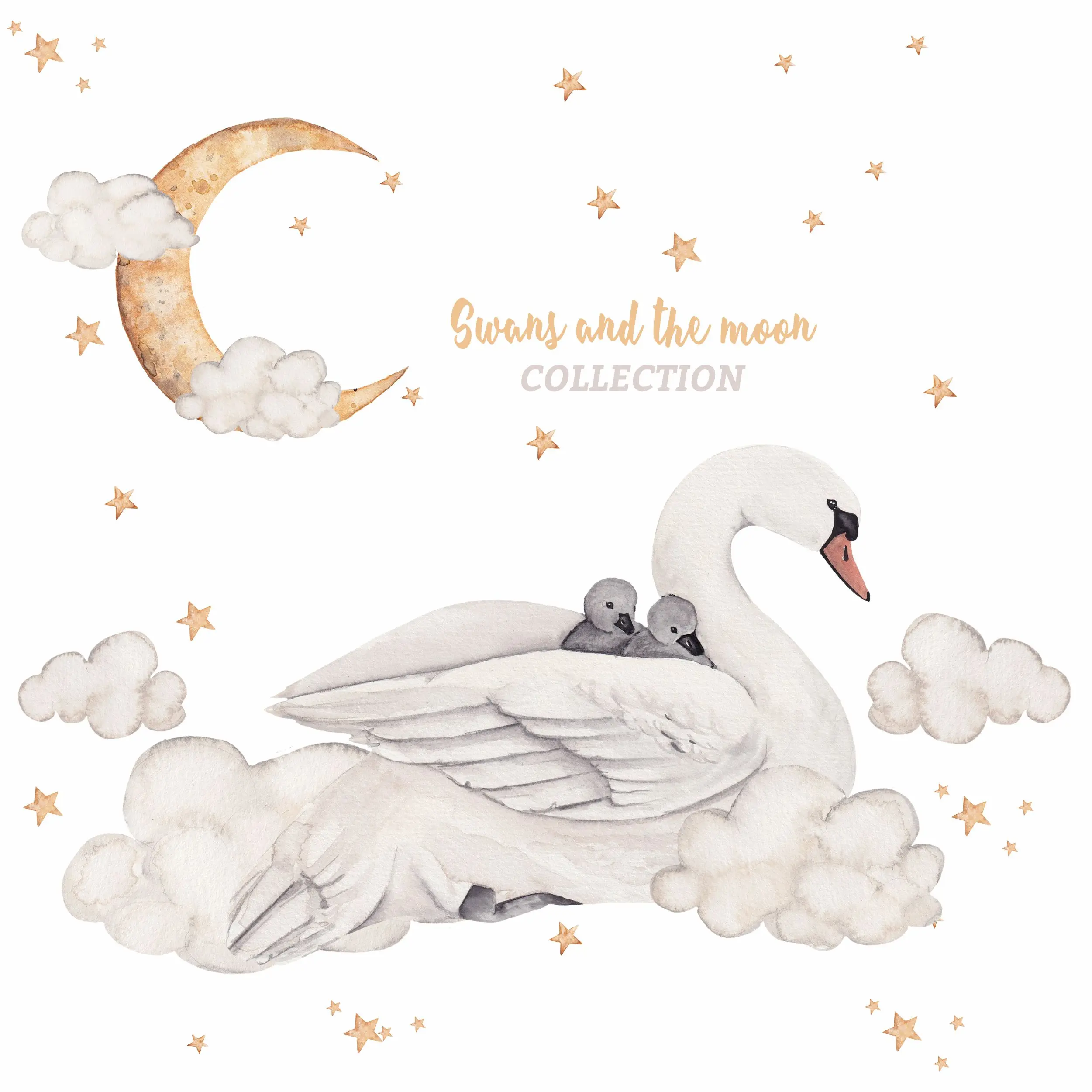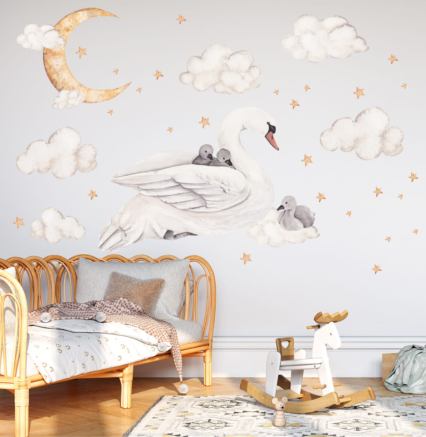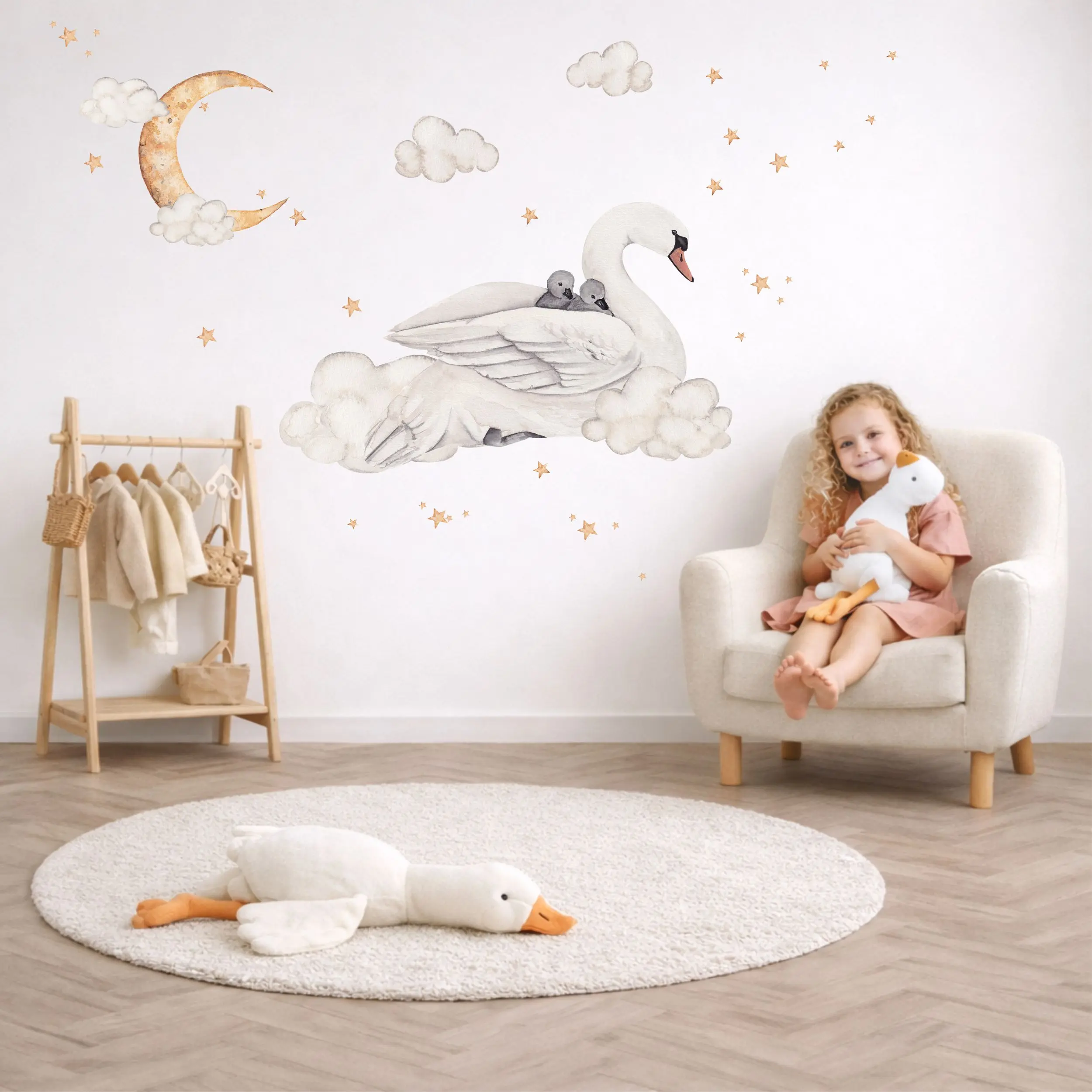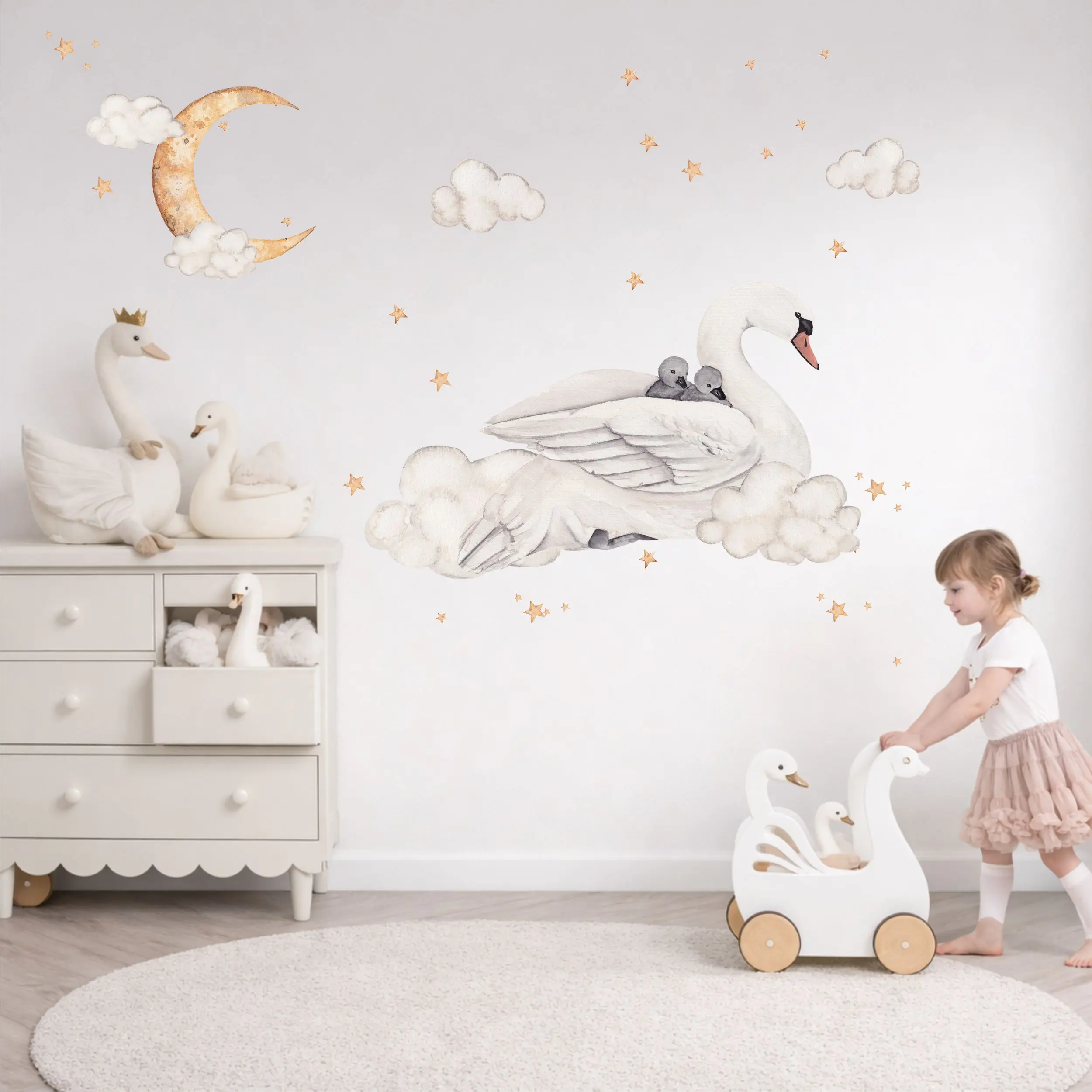 Ta naklejka na ścianę przedstawia delikatnego łabędzia z łabędziątkami w otoczeniu chmurek i gwiazd. Motyw jest spokojny i lekki, dlatego dobrze sprawdza się w pokoju dziecka – zarówno u niemowlaka, jak i u starszego malucha.