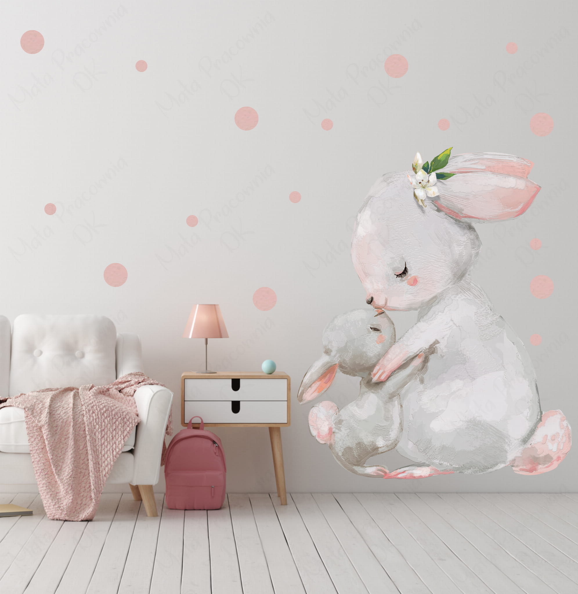 Pastelowe kropki do zajączka https://www.malapracownia.com.pl/pl/p/Naklejka-na-sciane-dla-dzieci-kroliczek-z-mamusia/425