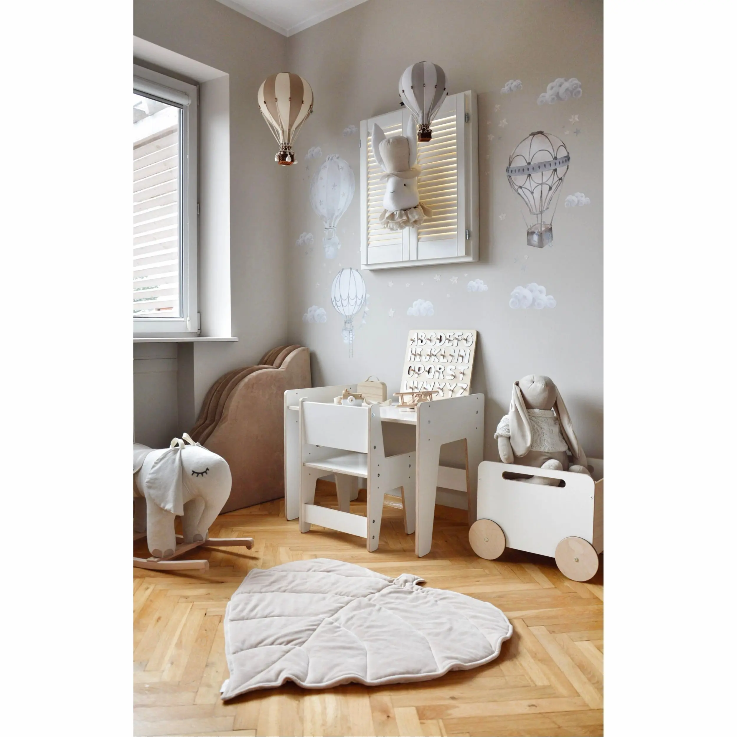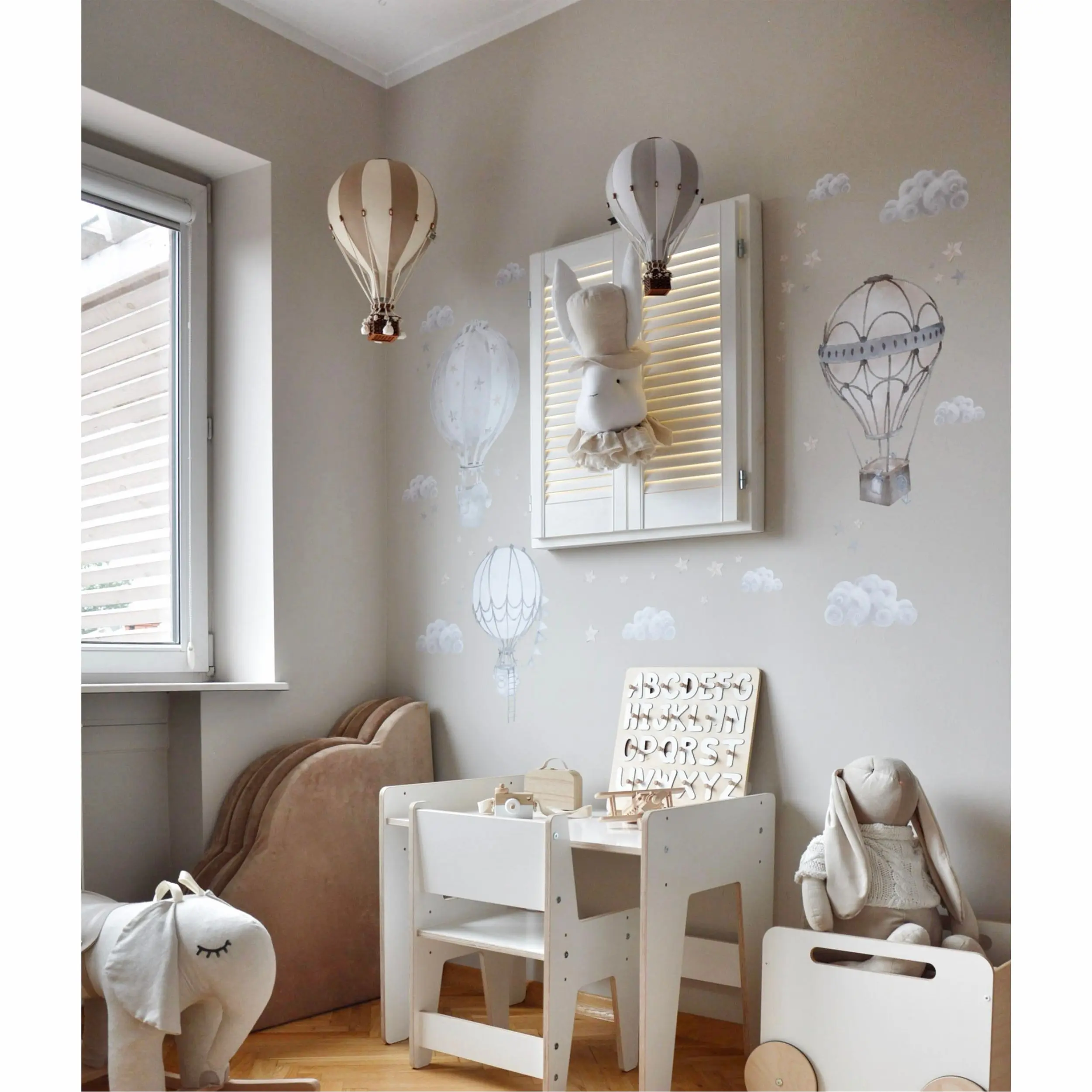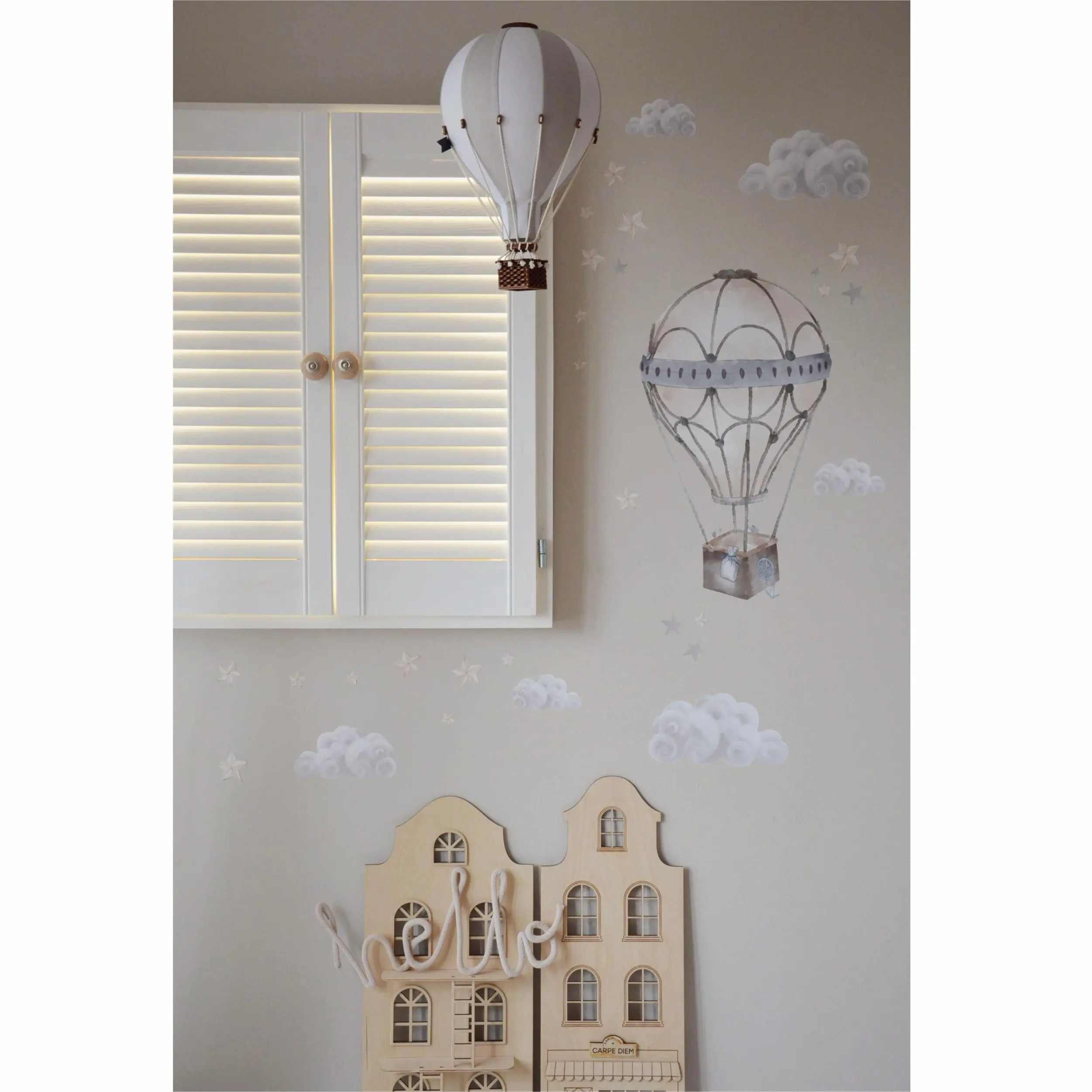Naklejki na ścianę z motywem beżowo-szarych balonów i chmurek. Zestaw wycinanych elementów bez tła do pokoju dziecka.