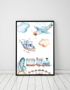 Plakat dla chłopców samolot,miasto,ciuchcia