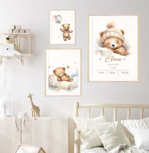 Zestaw 3 plakaty pastelowe misie beż - Wzór 6