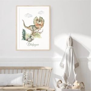 Akwarelowy plakat z Dilofozaurem — idealny do pokoju małego miłośnika dinozaurów. Delikatne kolory i przyjazny wygląd tworzą ciepłą, przyjazną przestrzeń.