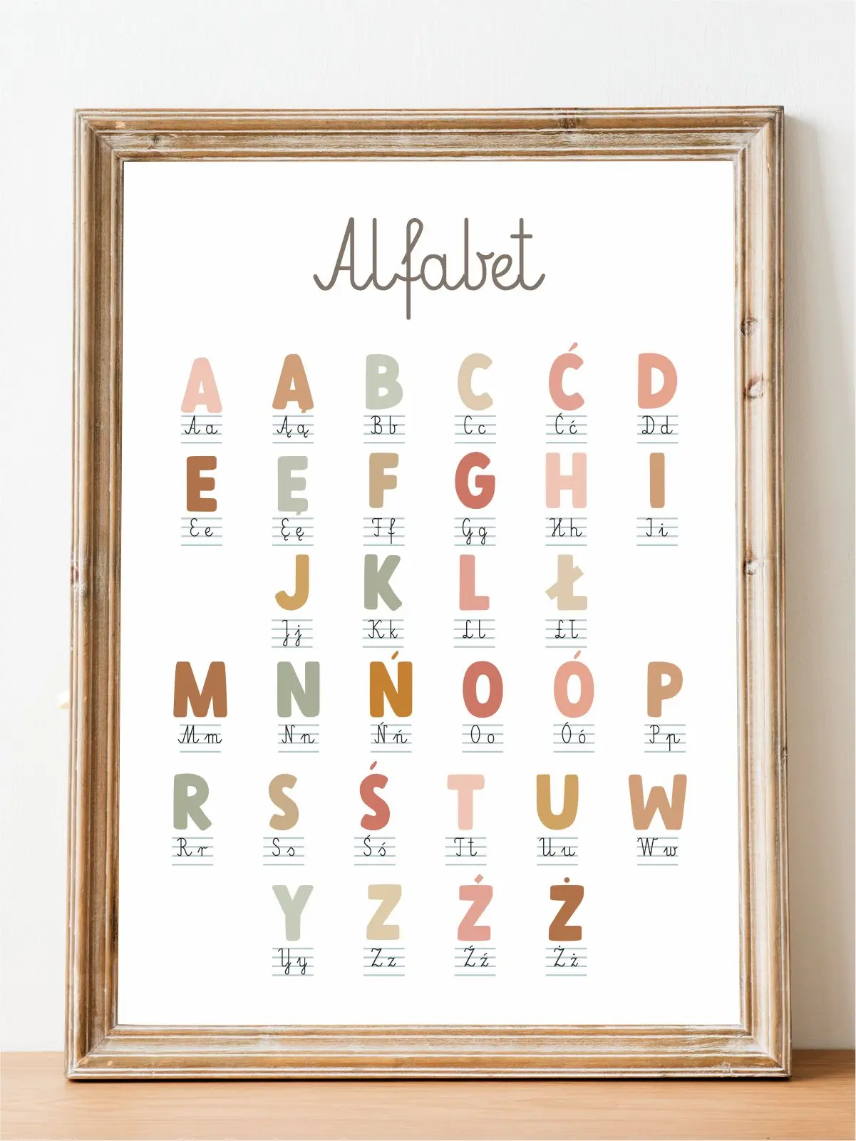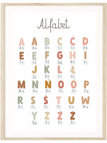 Plakat edukacyjny Montessori z alfabetem w stylu boho to idealne wsparcie w nauce literek dla najmłodszych. Delikatne barwy ziemi, czytelny układ oraz zapis liter pisanych i drukowanych sprawiają, że nauka alfabetu staje się naturalna i przyjemna. To połączenie funkcji edukacyjnej i estetycznej — świetnie sprawdzi się w przedszkolu, pokoju malucha oraz przestrzeni w duchu Montessori, boho i vintage.