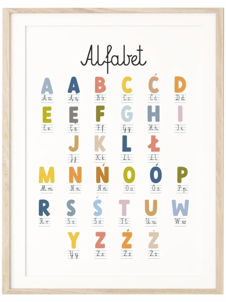 Plakat Edukacyjny Montessori – Alfabet | Wzór 2 | dla Dzieci to starannie zaprojektowany plakat wspierający naukę liter. Dzięki wyraźnym literom i prostemu układowi dziecko w naturalny sposób zapamiętuje alfabet. Plakat wpisuje się w filozofię Montessori – rozwija samodzielność, pamięć wzrokową i koncentrację.